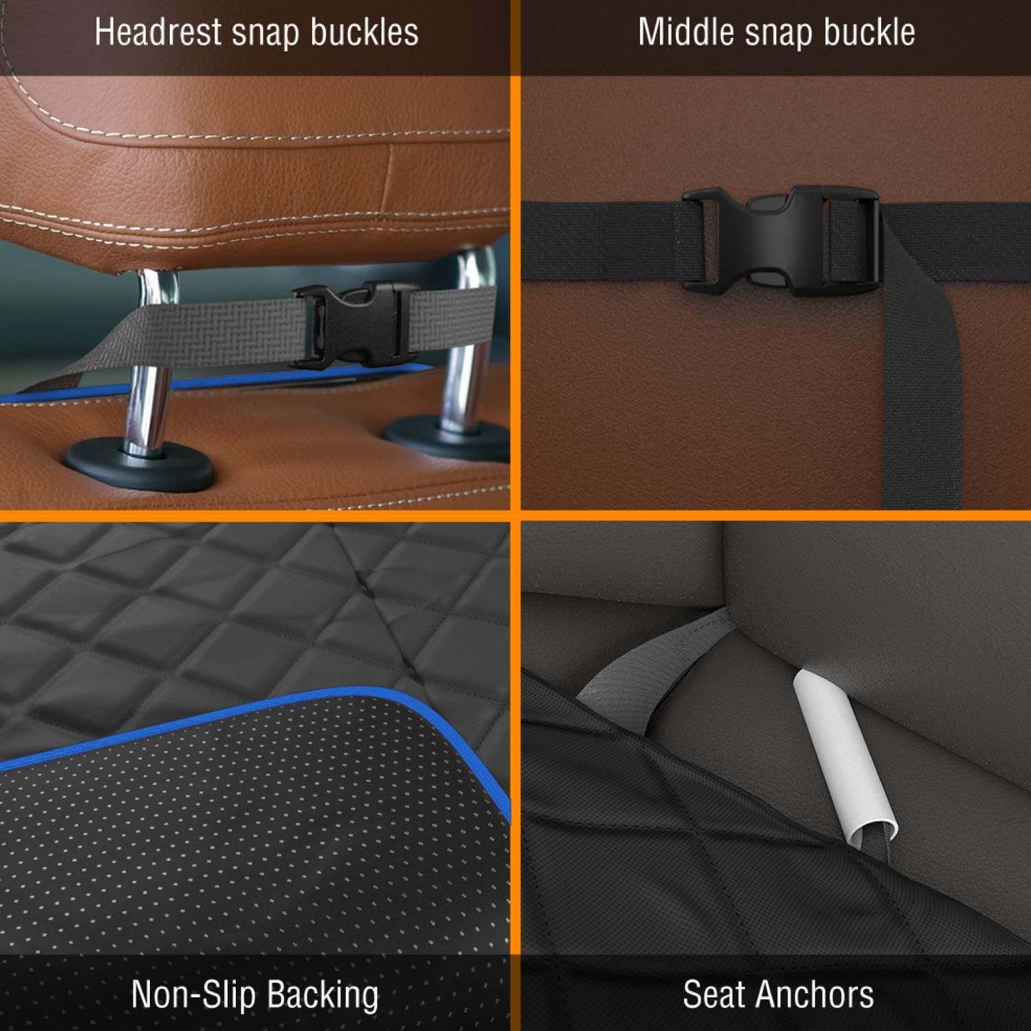- Safety First - With four levels of security protection, our pet cover for front seats is designed to keep your pet safe and secure. It comes with one heavy-duty buckle for the headrest and backrest, a seat anchor, and a non-slip bottom to ensure that your pet stays in place!