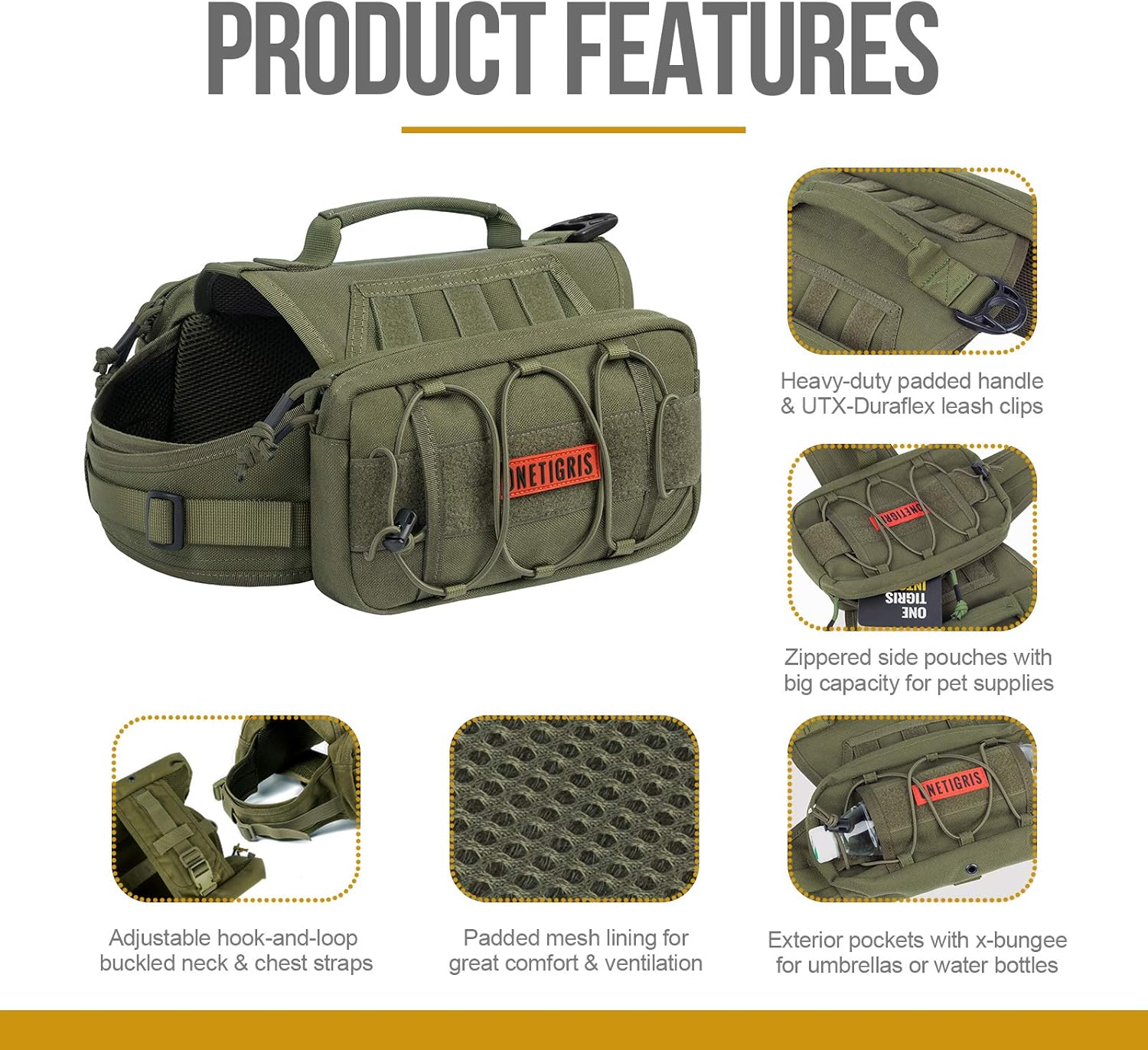 - OneTigris MAMMOTH Dog Pack (Upgraded Version): Durable 1000D nylon with mesh lining for breathability to maximize function and comfort on lengthier outings