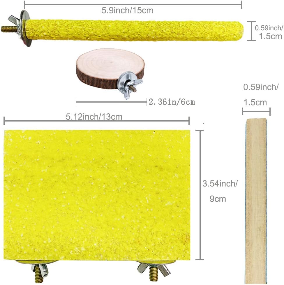 - 8 PACK BIRD PERCH STAND TOY : Perfect bird cage accessories toys to decorate your birds cage. You can get 6 parrot perch toys with one purchase.The parrot perch stand platform is 5.12 Ă— 3.54 Ă— 0.59 inch and two types of boards allow your pet to choose freely. The length of the paw grinding stick is 5.9 inch and the diameter is 0.59 inch