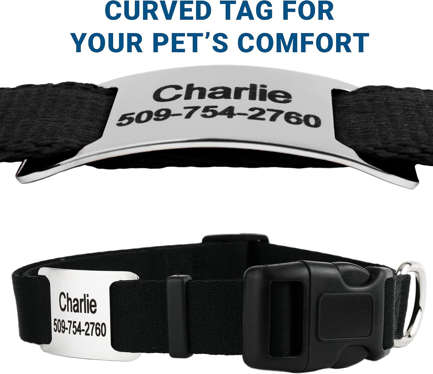 GoTags Personalized Dog Collar with Nameplate, Adjustable Dog Collar with Custom Engraved Slide On Pet ID Tag in Stainless Steel, Silent, No Noise Dog Tag for Large Medium and Small (Black, Large)