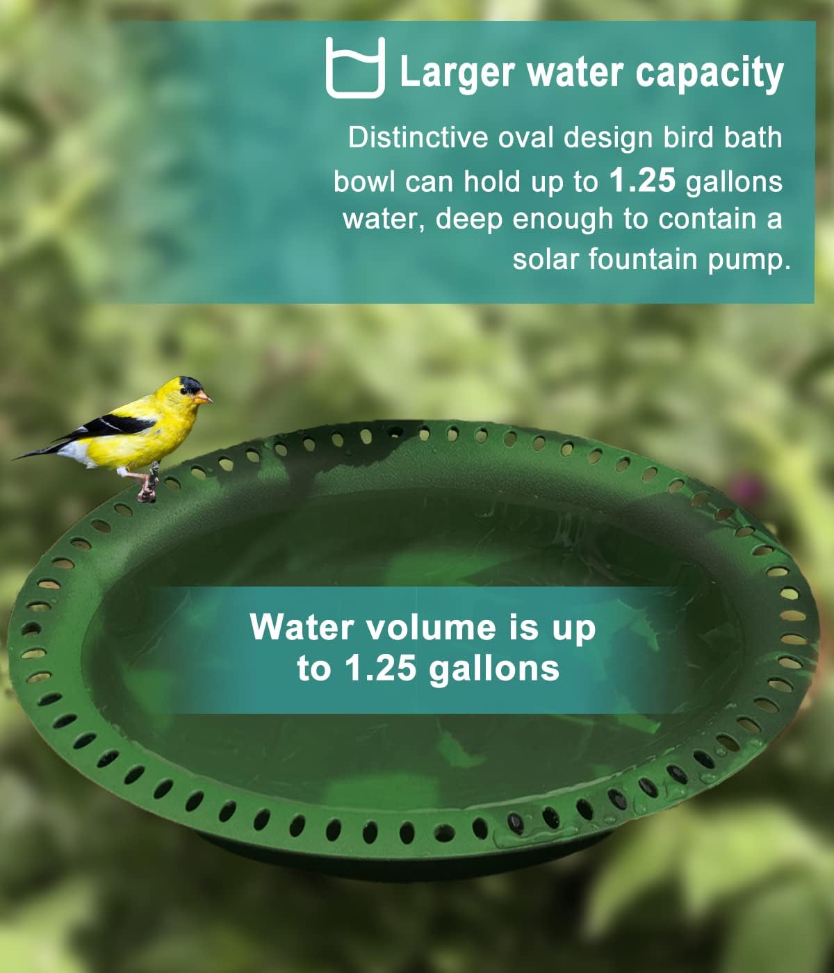 - More capacity & Oblong shape: This extra-large bird bath has an OBLONG tray with small holes along the edges, providing a stable standing and resting environment for the lovely bird friends. Bird friendly color--Green color basin is gentle and unobtrusive in your outside areas, and deep enough for contain a solar fountain pump. (Bowl dimension: 17.2” L × 13.2” W, bowl depth: 2.76 inches.)