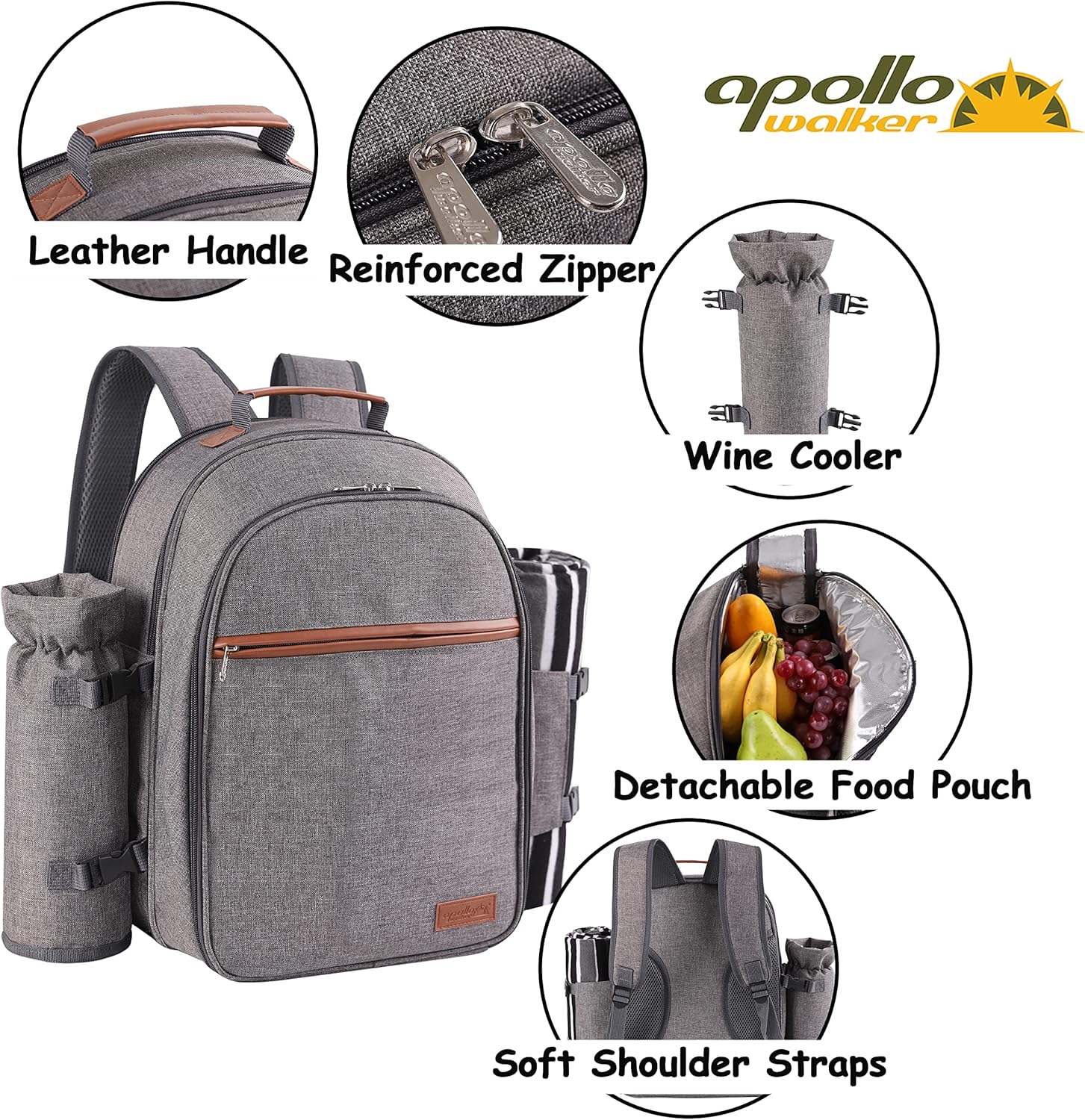 Apollo Walker Picnic Backpack Set for 2 Person with Cooler Compartment, Detachable Bottle/Wine Holder, Fleece Blanket, Plates and Cutlery Set