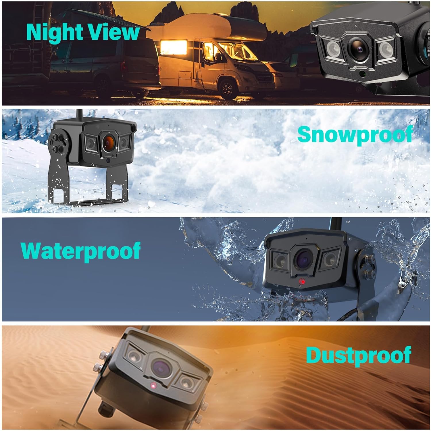 - ๐๐ Long Signal Transmission Distance - This trailer backup camera wireless with monitor is suitable for Cars, RV, Truck, Semi-Trailer, Pickups, Camper, Van, 5th wheel, Motorhome. The signal can reach over 300ft in open area, and 50ft on vehicle for reversing or 36ft on vehicle for continuously use. With IP69K waterproof standard, the wireless backup camera rv can work in extreme weather from -4โ~176โ. No lens water or fog issues.