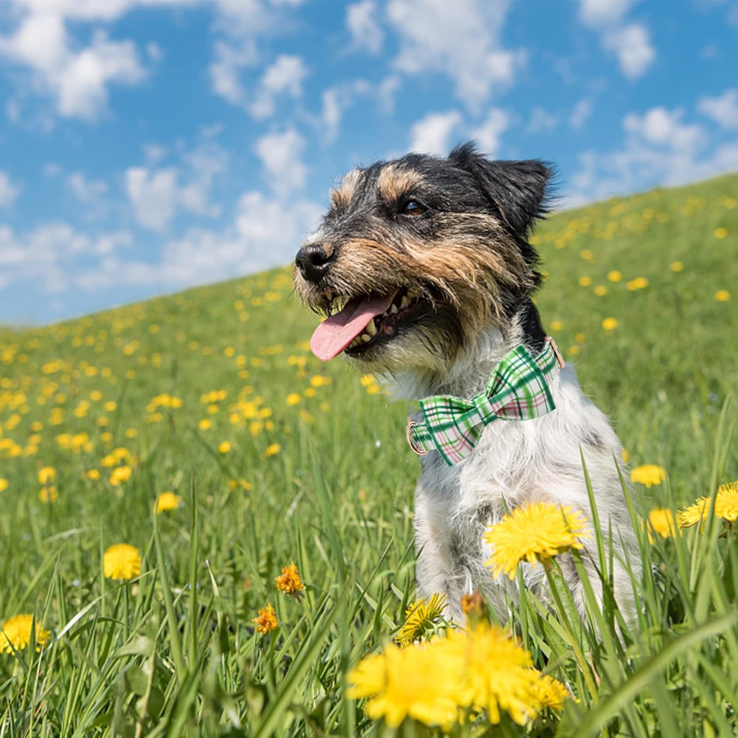 Elegant Little Tail Dog Collar with Bow - Pink with Green Plaid, Cute Bowtie, Adjustable for Medium Dogs