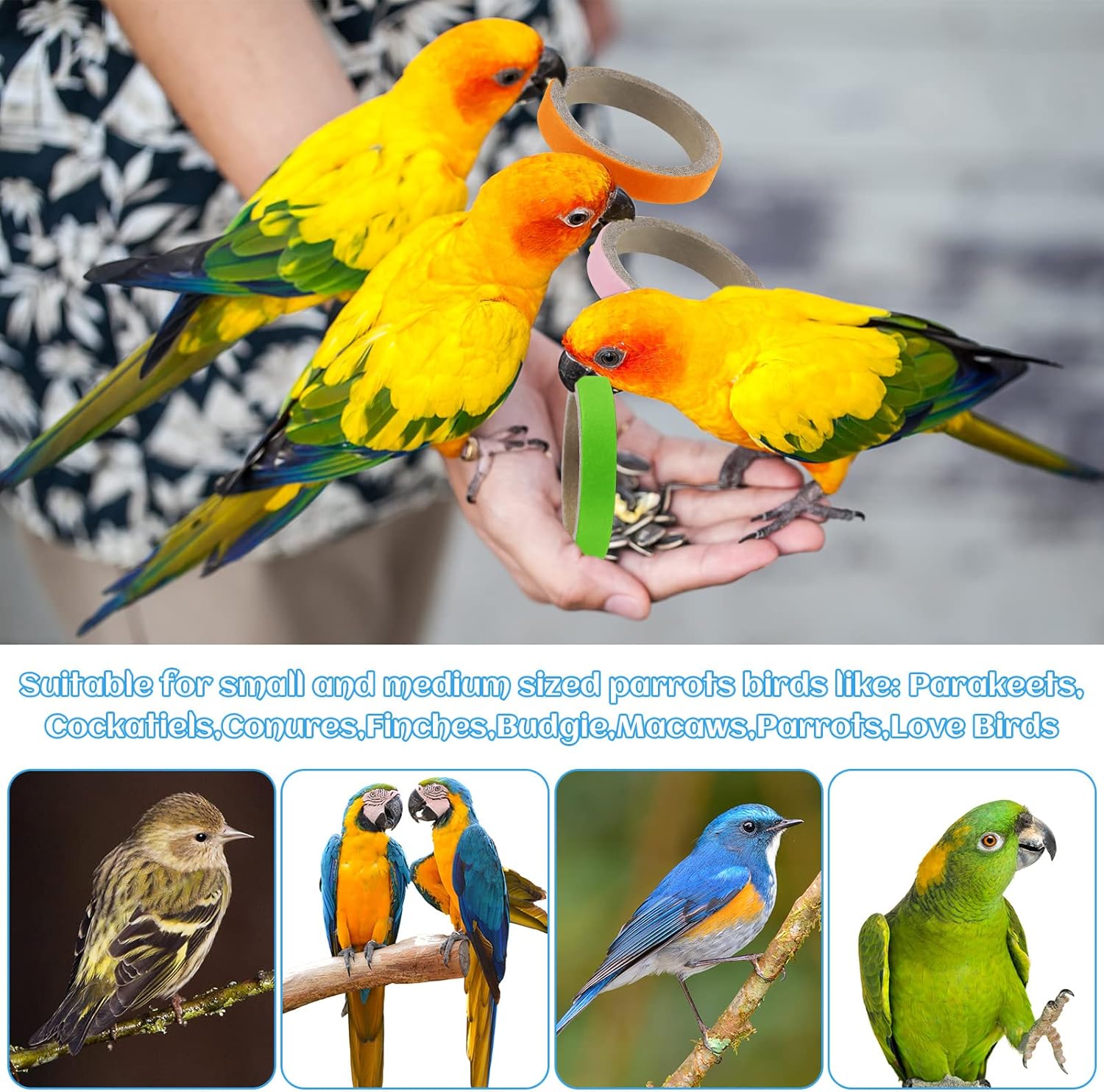 - Size: our bird chew toys' outer diameter is 2.4 inches/ 6 cm, inside diameter is 1.97 inches/ 5 cm, and 0.31 inches/ 0.8 cm in width, suitable for birds of small and medium size, such as cockatiels, cockatoos macaws and similar sized pet birds