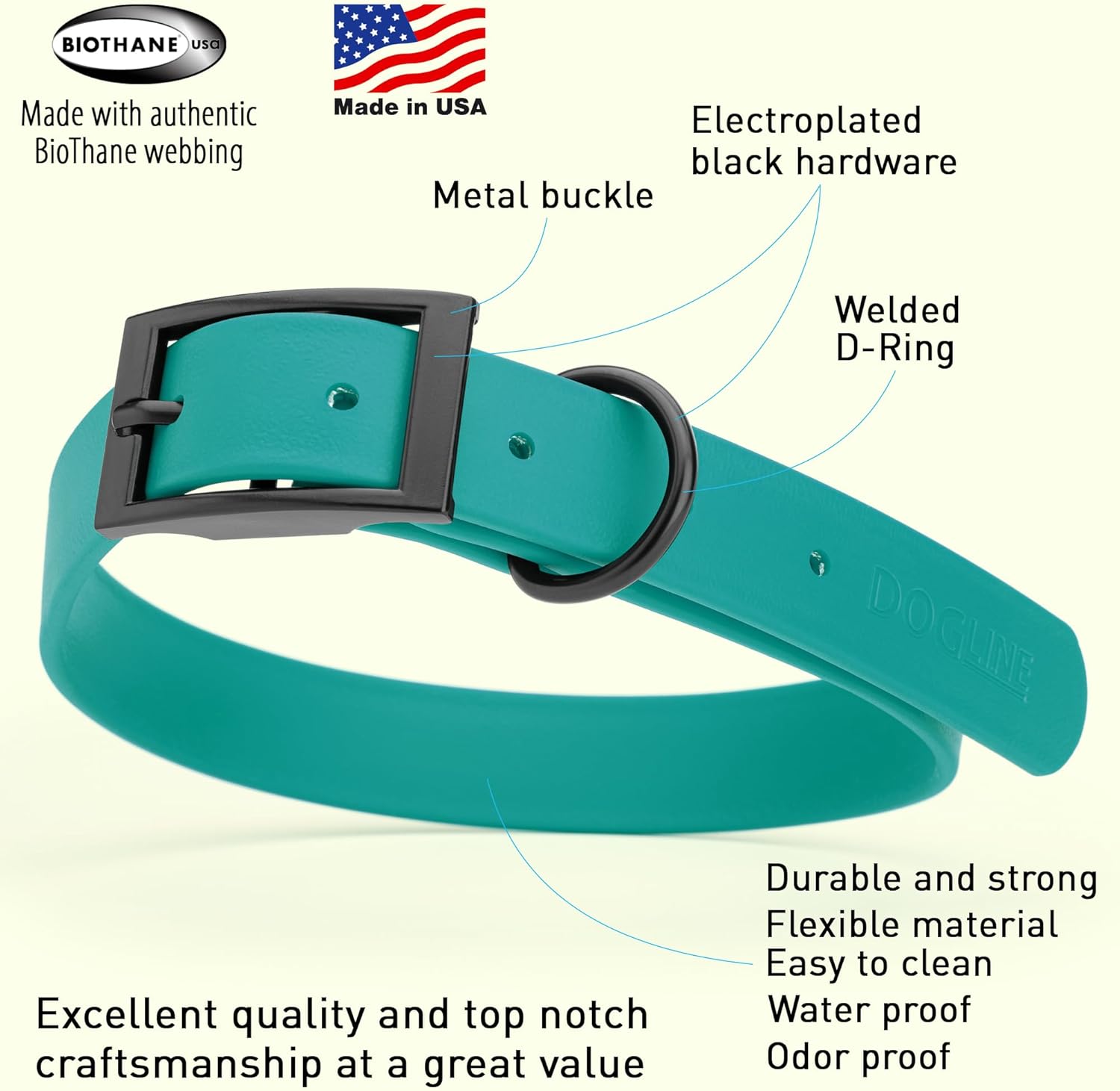 Dogline Biothane Waterproof Dog Collar Strong Coated Nylon Webbing with Black Hardware Odor- Proof for Easy Care Easy to Clean High Performance Fits Small Medium or Large Dogs, Blue Aqua