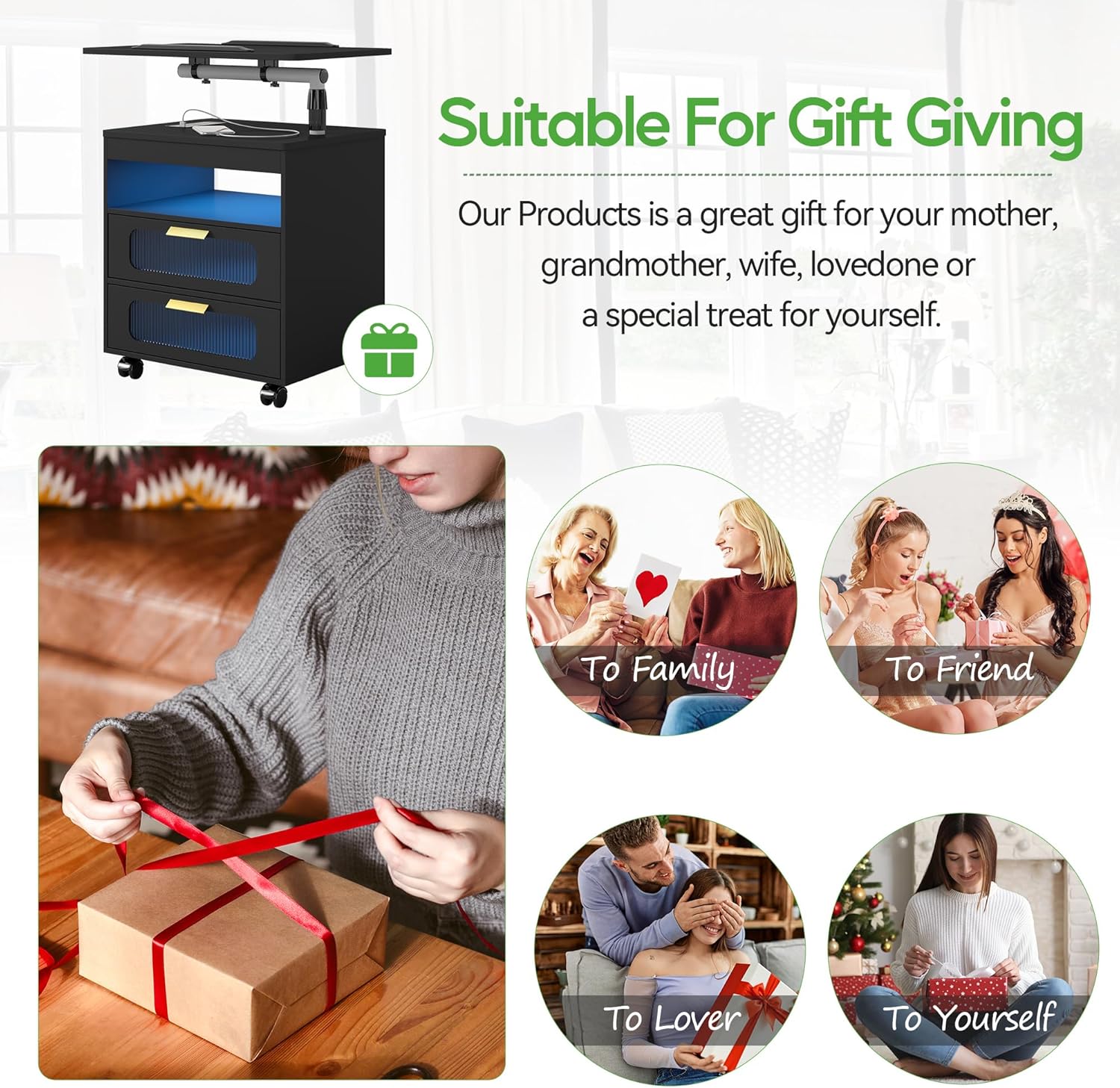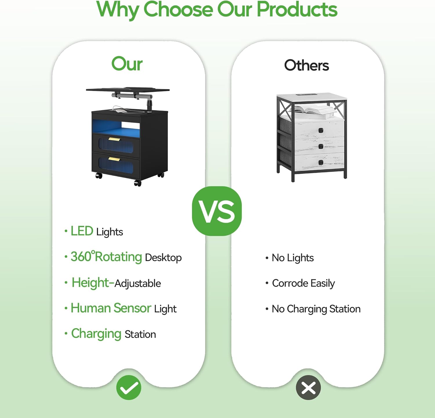- â ăNightstand with Wireless Charging Stationă Bedside table with wireless charging and USB/Type-C charging ports allows you to easily charge your mobile devices, laptops and iPads, making your life easier when you work in bed or on the sofa.