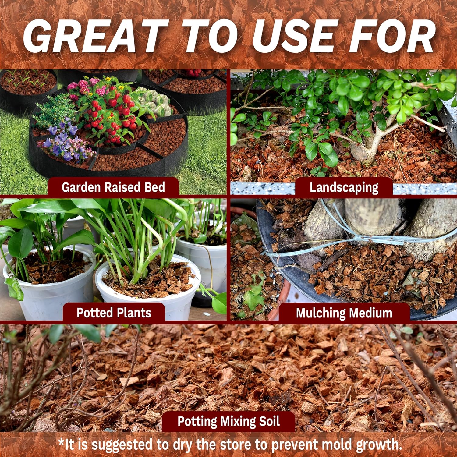 - [100% NATURAL & ORGANIC COCONUT CHIP]: Our coco chips bricks is made from the coconuts husk, which are a natural and sustainable resource. It is providing a natural and eco-friendly growing medium for your plants making coconut husk chips an eco-friendly choice for your gardening needs. As well landscaping, reptile bedding, terrarium bedding, and ground covering.