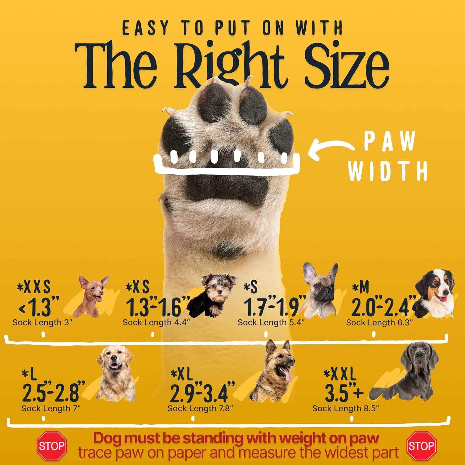 - XXL fits paws 3.5" - 3.8". Measure while dog is standing with weight on paw. Includes 4 dog grip socks. Snug fit is normal—extra grip makes them stiffer than other socks but provides better traction.