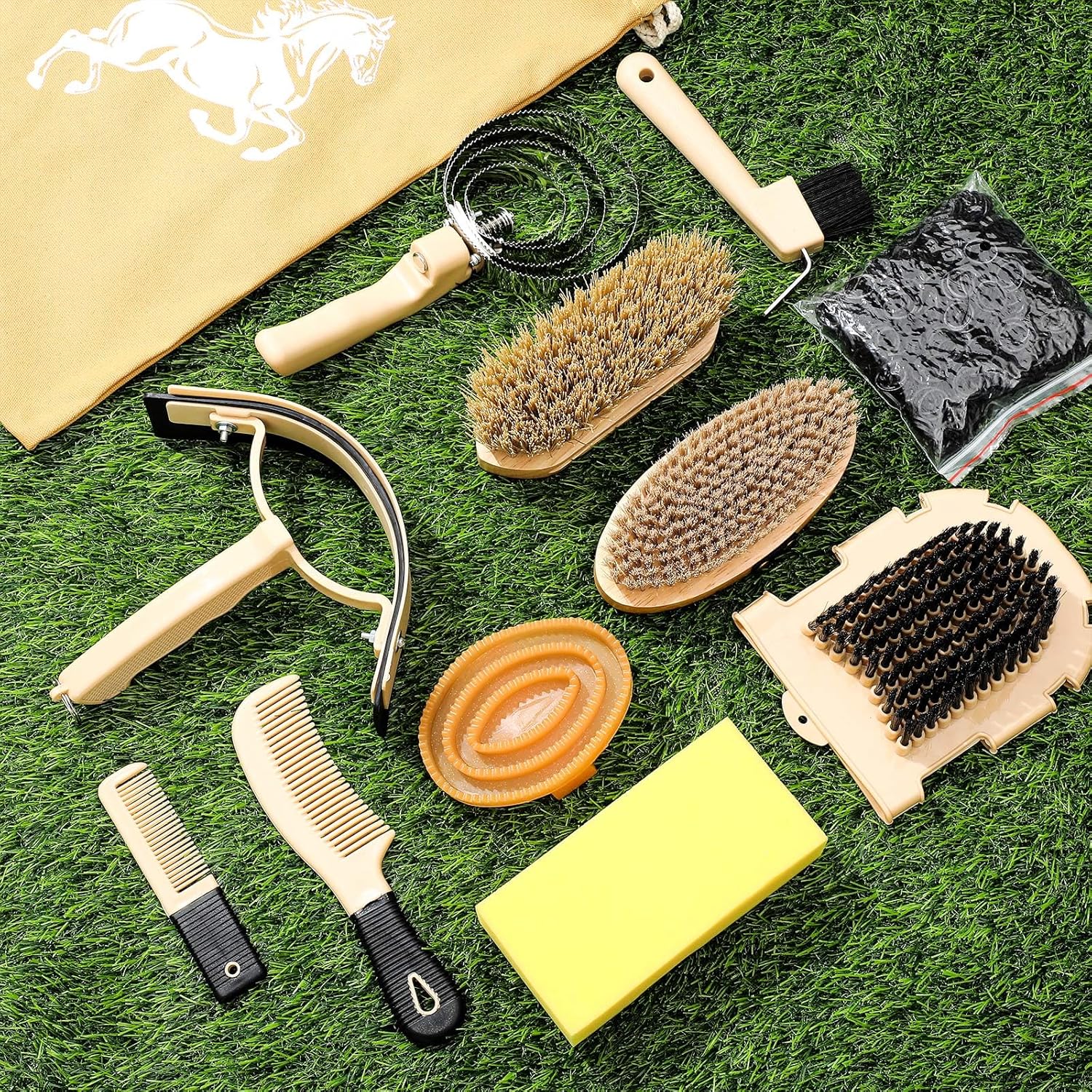 - Horse Grooming Kit: this horse grooming set includes storage bag, oval massage brush, hard brush, soft brush, sweat scraper, bath sponge, hoof pick with brush, mane comb, tail comb, rubber band, etc., a total of 12 pieces, such a nice and complete grooming set can satisfy your needs for grooming your horse