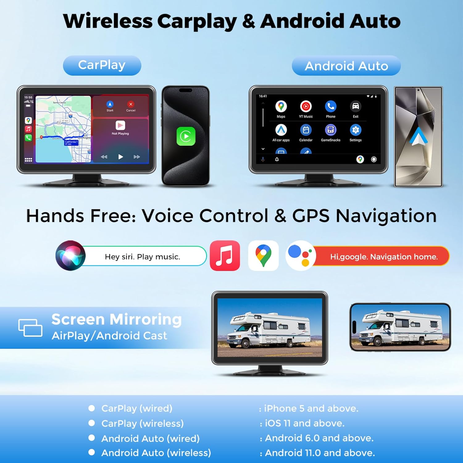 - ăVoice Control & Real-Time NavigationăThis amazing HD 10-inch wireless CarPlay backup camera with screen is your gateway to real-time GPS navigation! Connect it to your phone's CarPlay or Android Auto and it'll keep you up to date with the latest road conditions from Google Maps and Waze. It'll even suggest the best route for you! And with Siri or Google Voice Assistant, you can answer calls, play music, and navigate home hands-free, making your drive safer and more enjoyable.