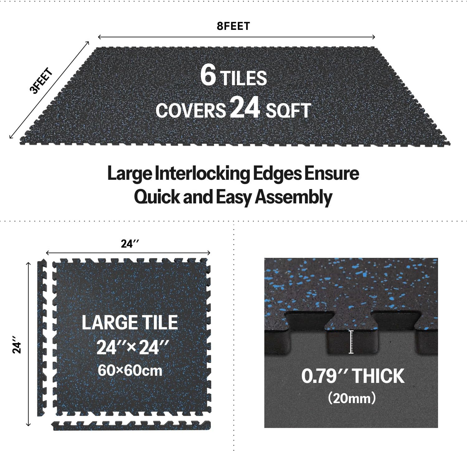 - [Easy to Assemble and Detach]: 6 tiles (24" x 24" x 0.79" each), covers 24 sq ft (6 Ă— 4 ft). Upgraded larger interlocking locks provide a secure fit, preventing any separation during use, ensuring you can work out without concerns of shifting. Simple assembly and detachment make it effortless to set up your home gym.