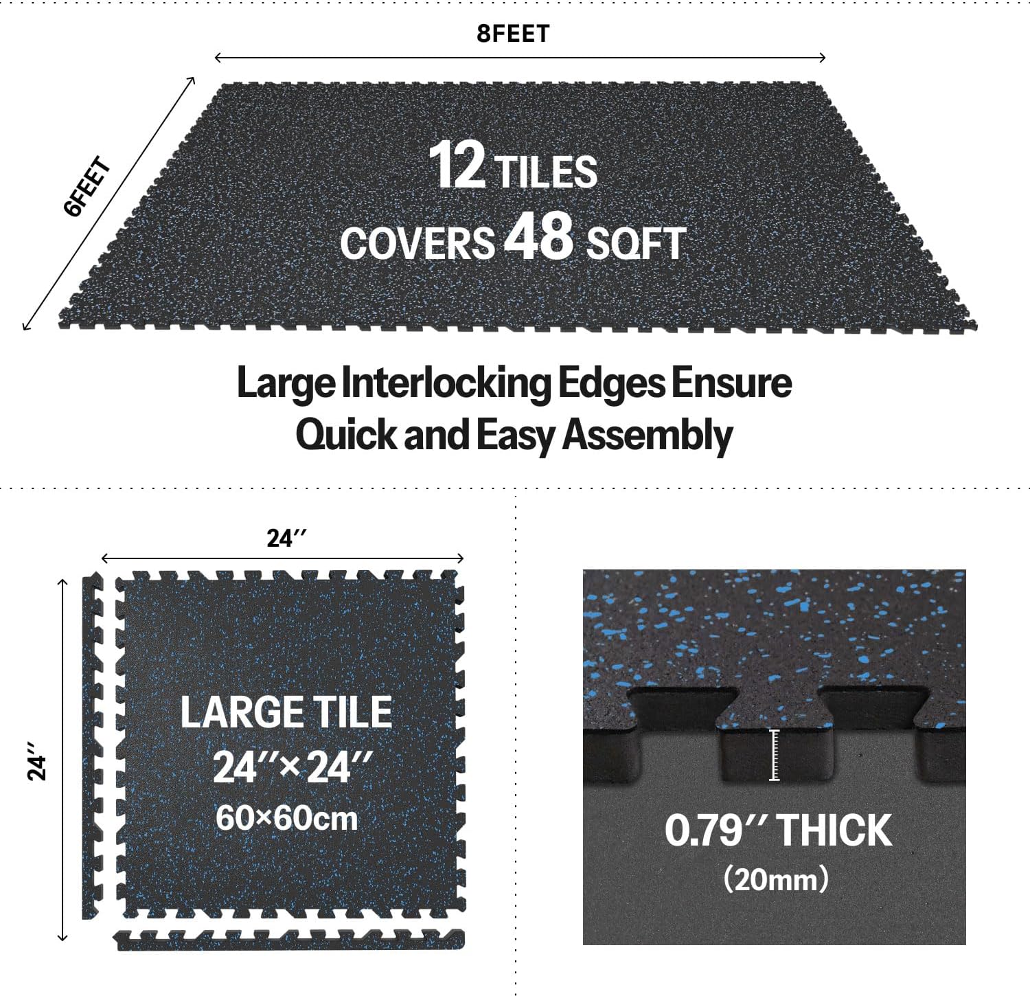 - [Easy to Assemble and Detach]: 12 tiles (24" x 24" x 0.79" each), covers 48 sq ft (8 Ă— 6 ft). Upgraded larger interlocking locks provide a secure fit, preventing any separation during use, ensuring you can work out without concerns of shifting. Simple assembly and detachment make it effortless to set up your home gym.