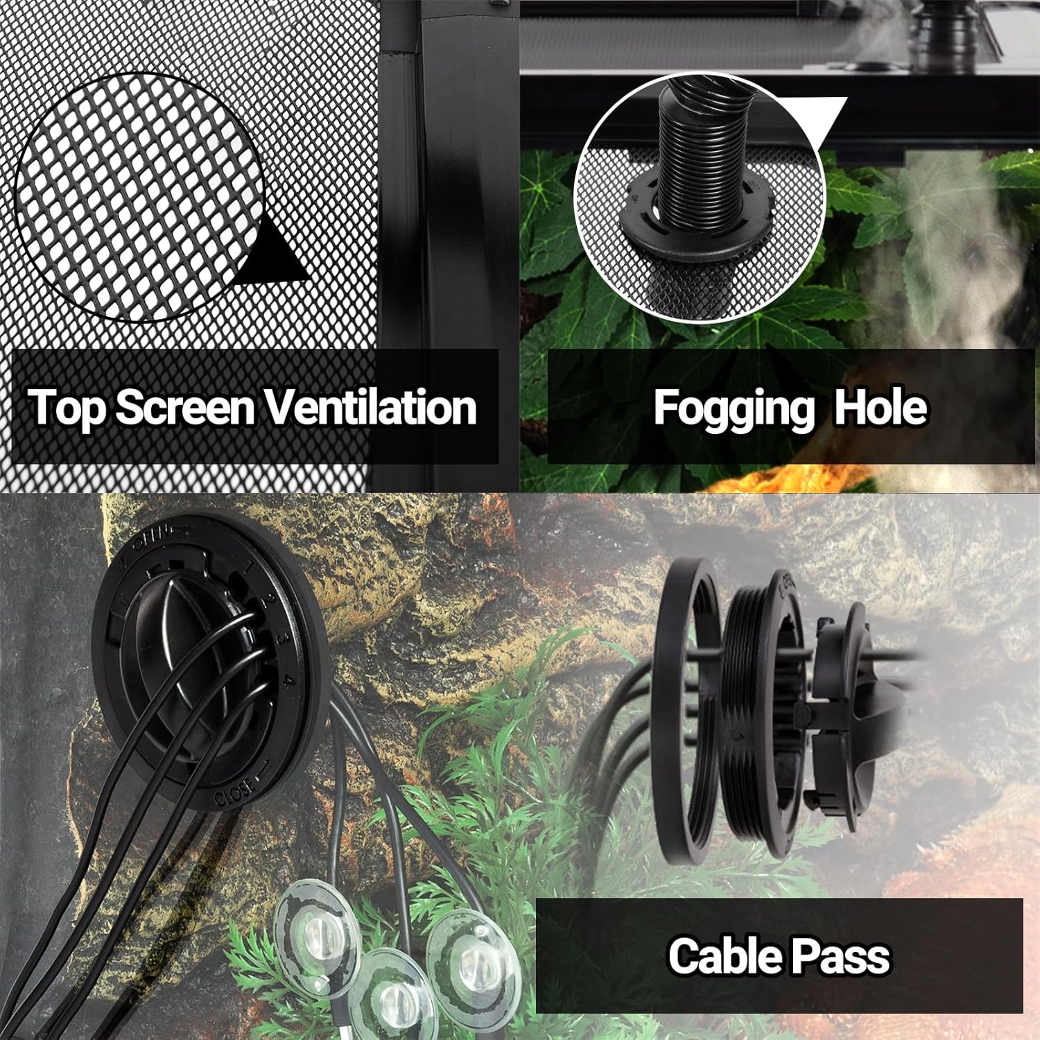 - Top Screen Ventilation and Fogging Hole: This reptile tank has used thin wire top screen which provides ventilation and allows uvb and infrared penetration, advanced sealing design is adopted at the edge connection, also equipped with fog holes, supporting the use of reptile humidifier and other humidification equipment.