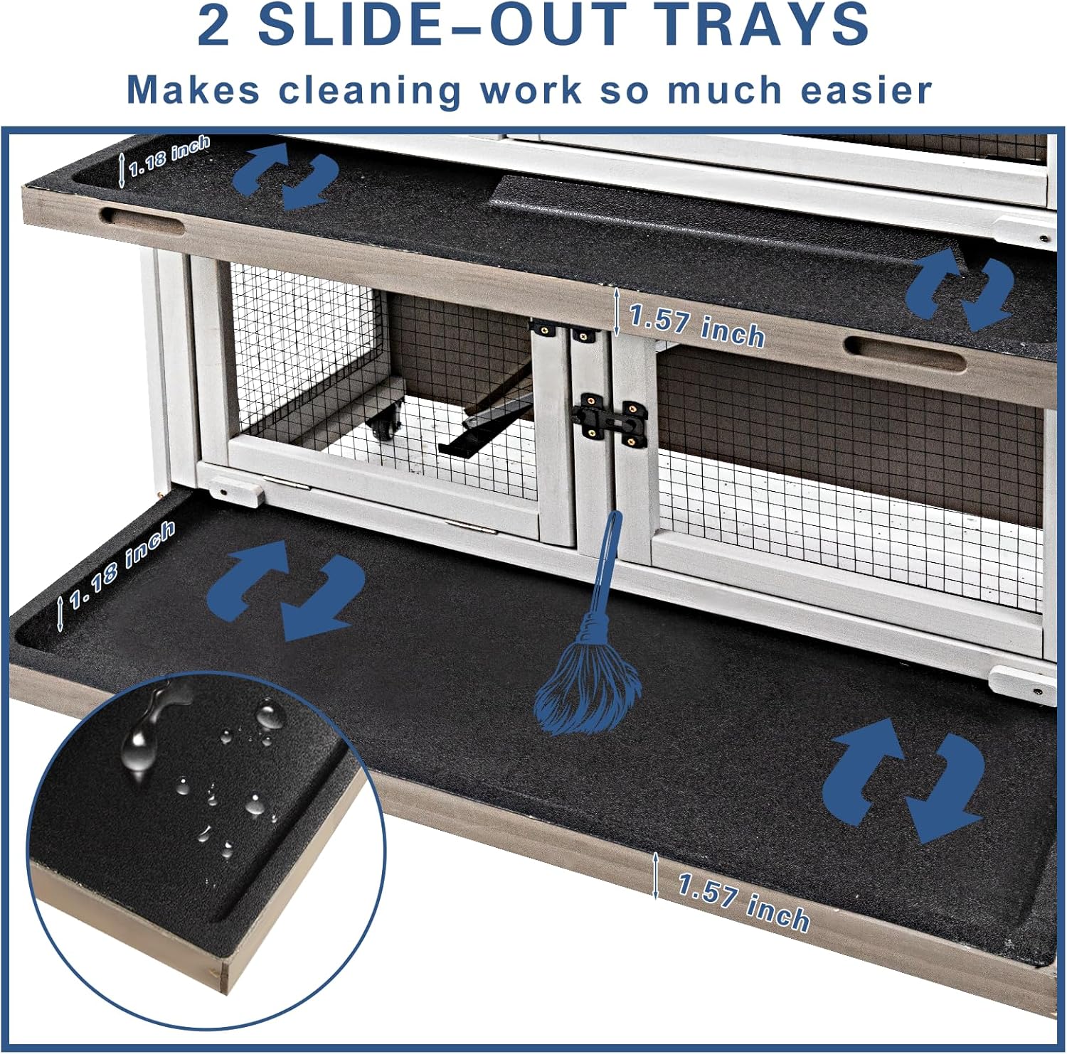 - đšă2 PULL OUT TRAYS & EASY TO MOVEăSay goodbye to messy cages and hello to easy maintenance! The bunny hutch is equipped with two deep no-leak trays that simplify cleaning, ensuring a clean and healthy living environment for your pets. Featuring four lockable metal wheels, this rabbit cage is easy to move, allowing you to provide your pets with a change of scenery indoors and outdoors. Whether you want to bring them closer to you or let them enjoy fresh air and sunshine, this cage offers the flexibility you need.