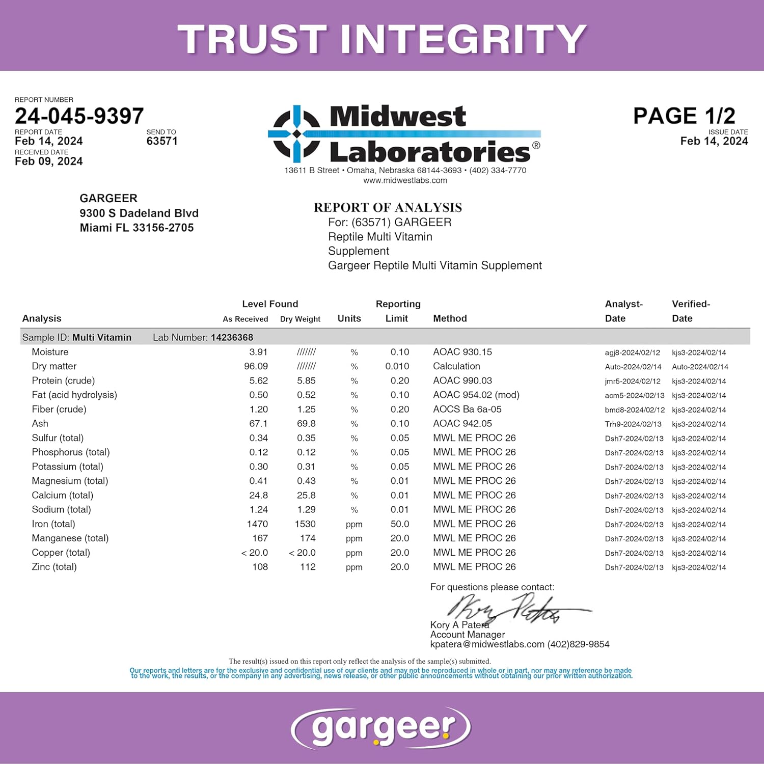 4oz All Reptile & Amphibian Multi-Vitamin Powder. Premium Supplement, Supports Growth, Recovery, and Development. Boosted with Minerals, Carotenoids, and Amino Acids. Made in USA. Enjoy!