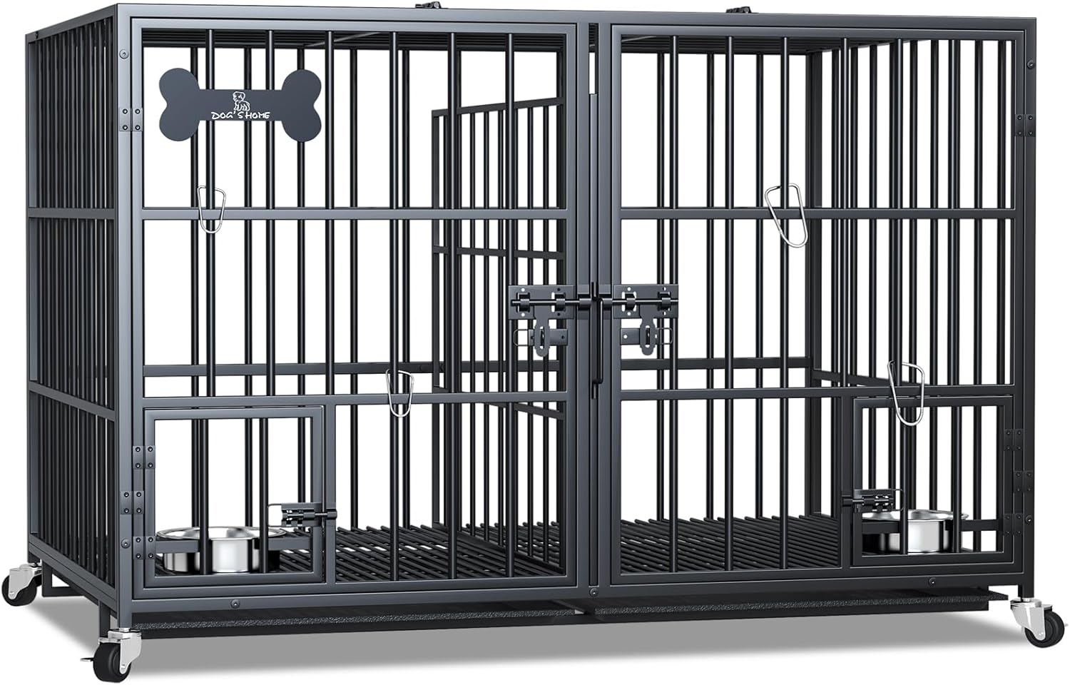 aboxoo 48/42 inch XL Dog Crate for Large Dog/Double Medium Dogs,Heavy Duty Metal Dog Cages,All Metal Open Top,Dog Kennel Indoor with Wheels,Floor Grid, Tray, Divider and Feeding Bowl