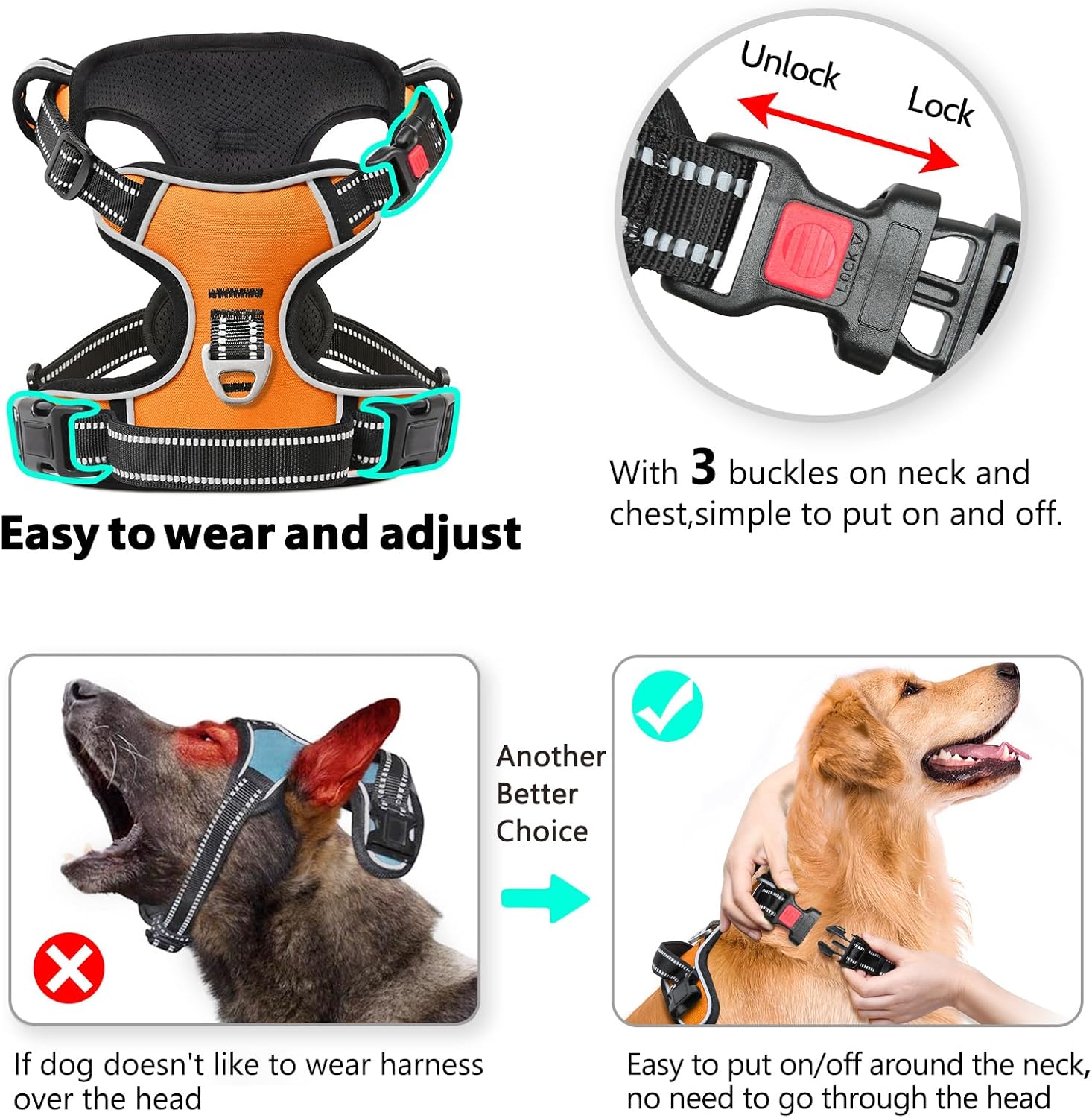 Timos Dog Harness Large Sized, No Pull with Neck Lockable Snap,No Choke Front Clip Dog Reflective Harness,Adjustable Metal Rings 3 Buckles,Easy Control Handle for Large Dogs Orange XL
