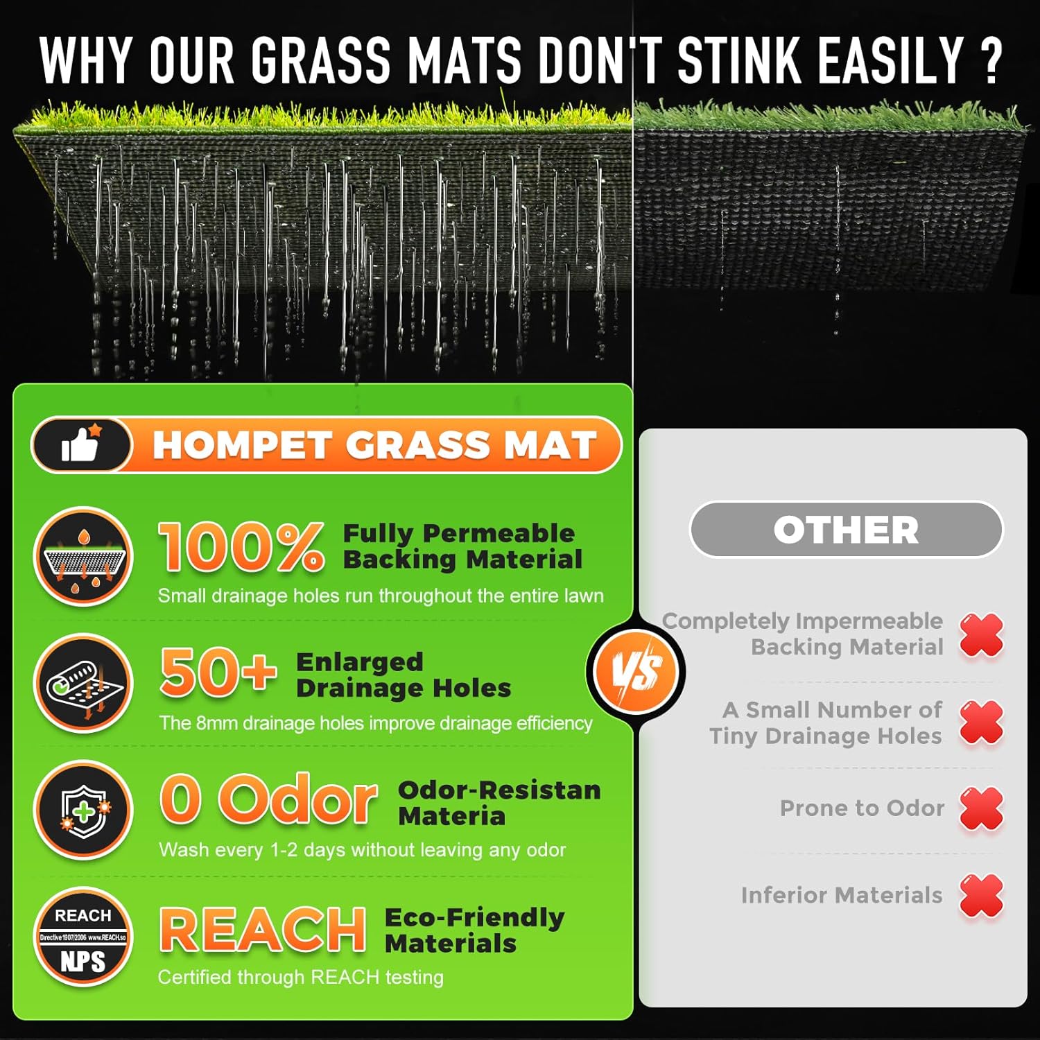 - 【2PCS REPLACEMENT ARTIFICIAL TURF】Chew-Resistant Hemming Design - prevents grass shedding & accidental ingestion by dogs, while enhancing durability; High-Density Realistic Artificial Grass - Mimics real grass feel for comfort and appeal, facilitating efficient potty training; Heavy-Duty Drainage Holes - Small drainage holes run throughout the entire lawn, with an additional 56 large ones added for enhanced permeability.