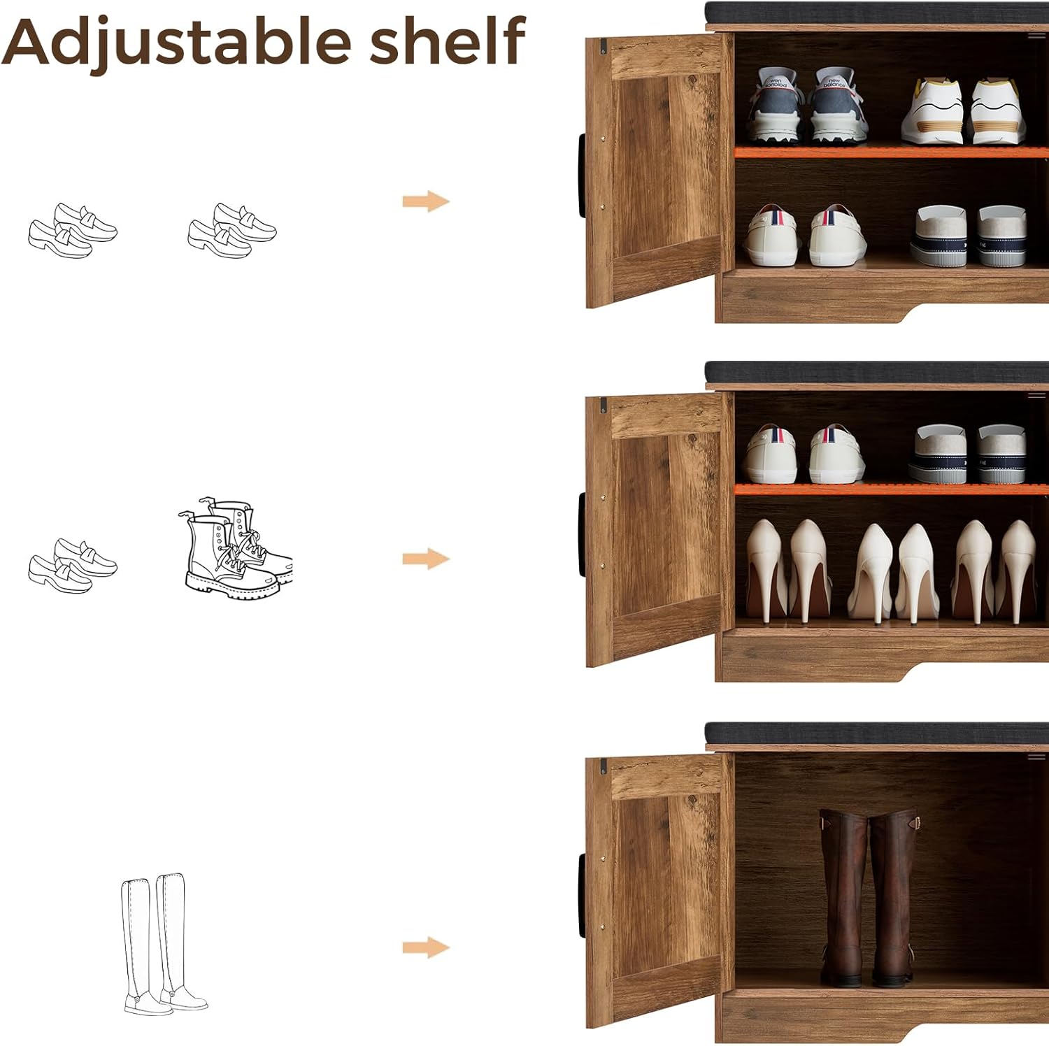 2-Tier Storage Bench, Shoe Bench with Padded Seat Cushion, Entryway Bench with 4 Barn Doors, Adjustable Shelf, 13.8" D x 47.2" W x 17.7" H, for Entryway, Living Room, Bedroom, Rustic Walnut