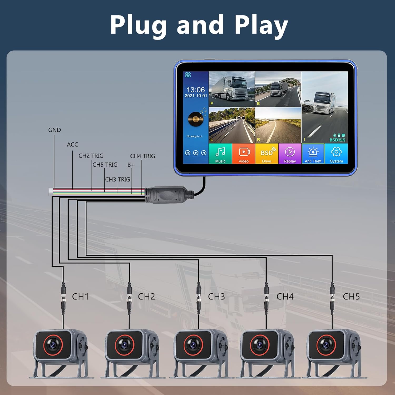 Hodozzy Backup Camera Monitor System,10.1 Inch IPS Reversing Monitor, 5 Split Screen with Five Waterproof Camera,IP68 Waterproof,Night Vision, Hard-Wired Backup Camera for Trucks/Bus/Trailer/RV