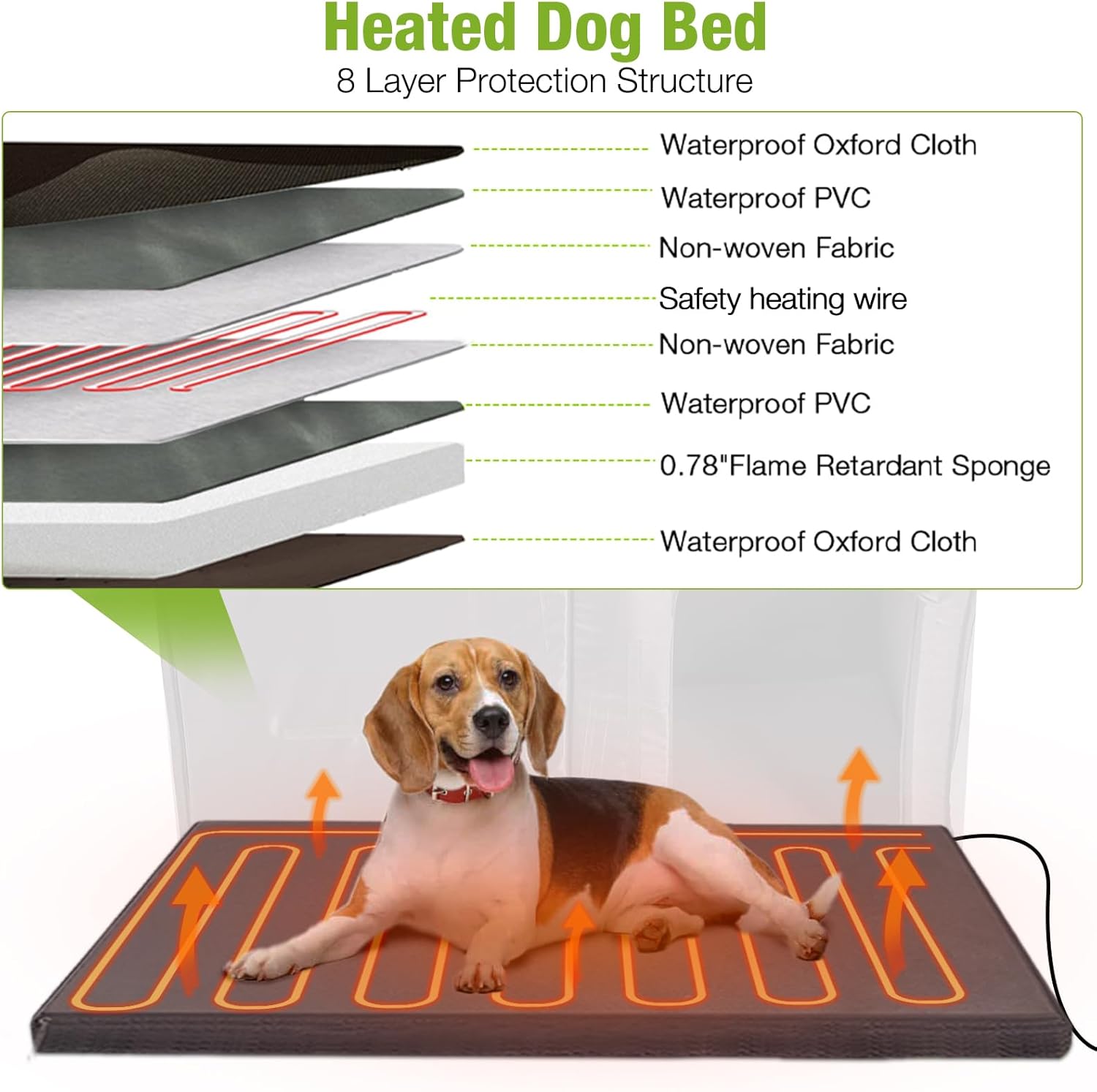 - Safe Heating System: UL-tested 12V heating pad with adjustable temperature (89-116°F), time settings (2, 4, 6 hours),preventing overheating or chilling, ensures consistent warmth. 6.5 ft chew-resistant cord adds an extra layer of safety