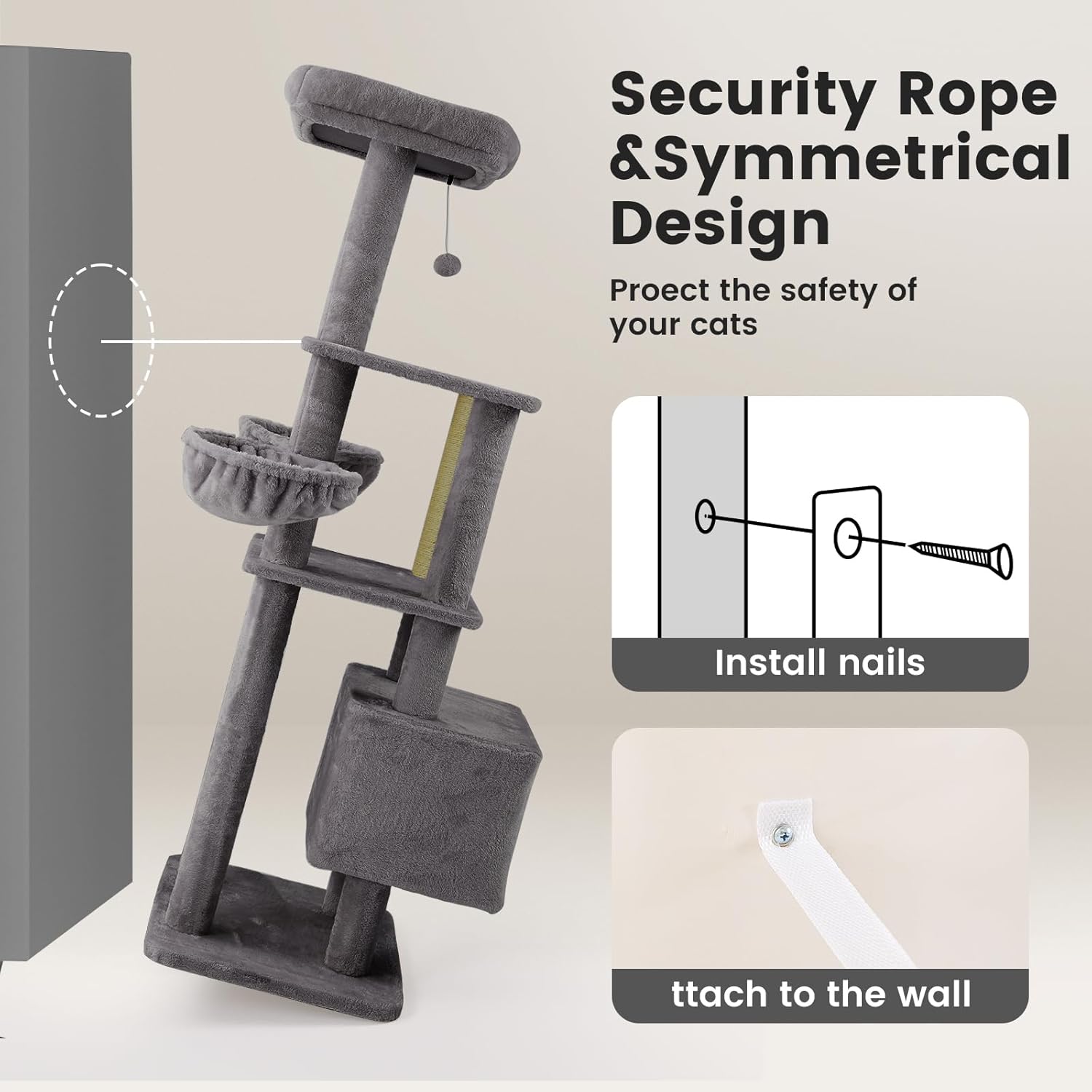 Gardner Pet 65in Heavy Duty Cat Tree Tower for Large Cats, Multi-Level Cat Furniture with Replaceable Sisal Scratching Post, Hammock | Extra-Large Platform & Condo (Grey)