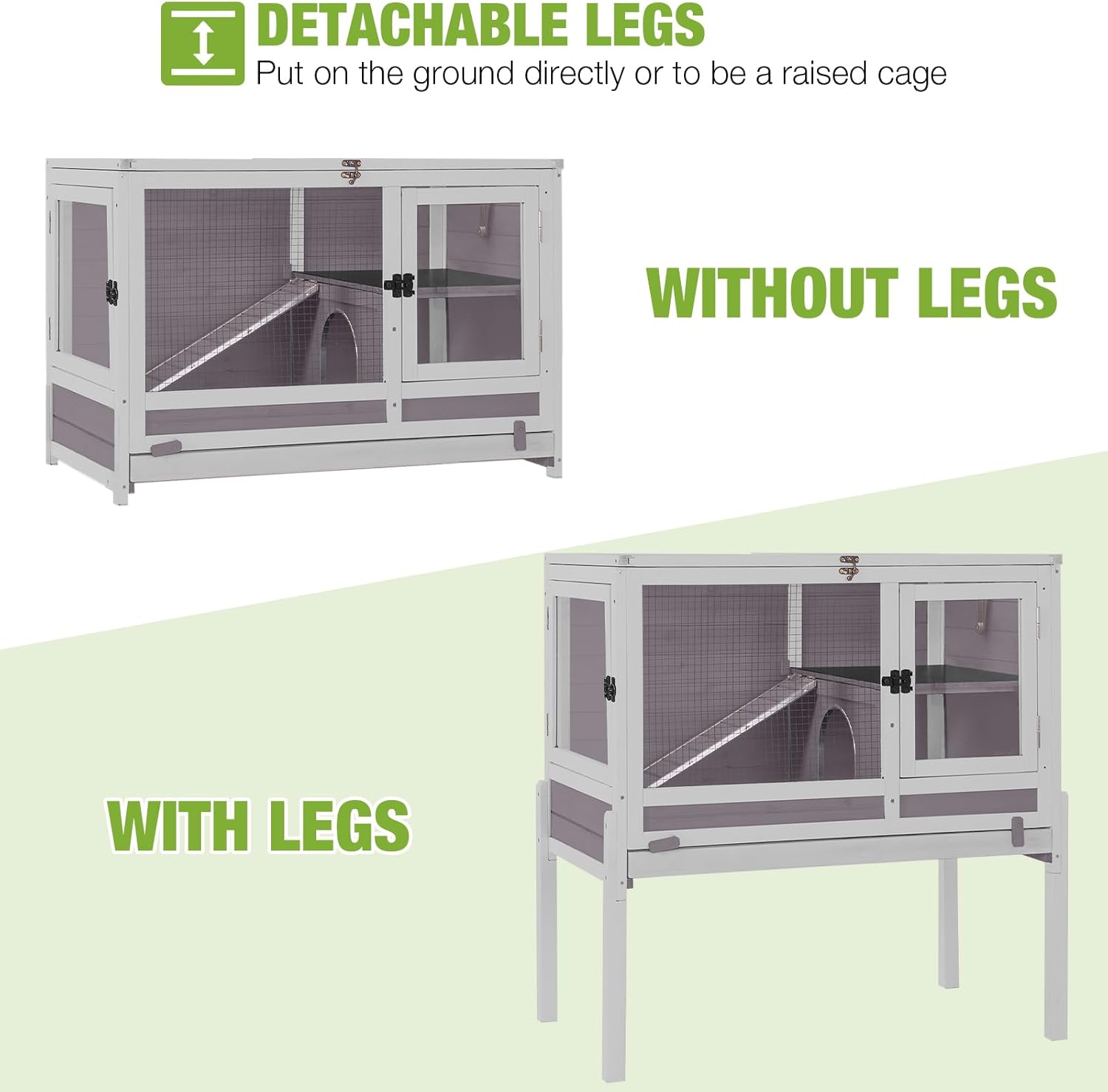 - Adjustable And Removable Legs: Comes with sturdy, removable legs for versatile placement. Use as a free-standing bunny cage or on a flat surface