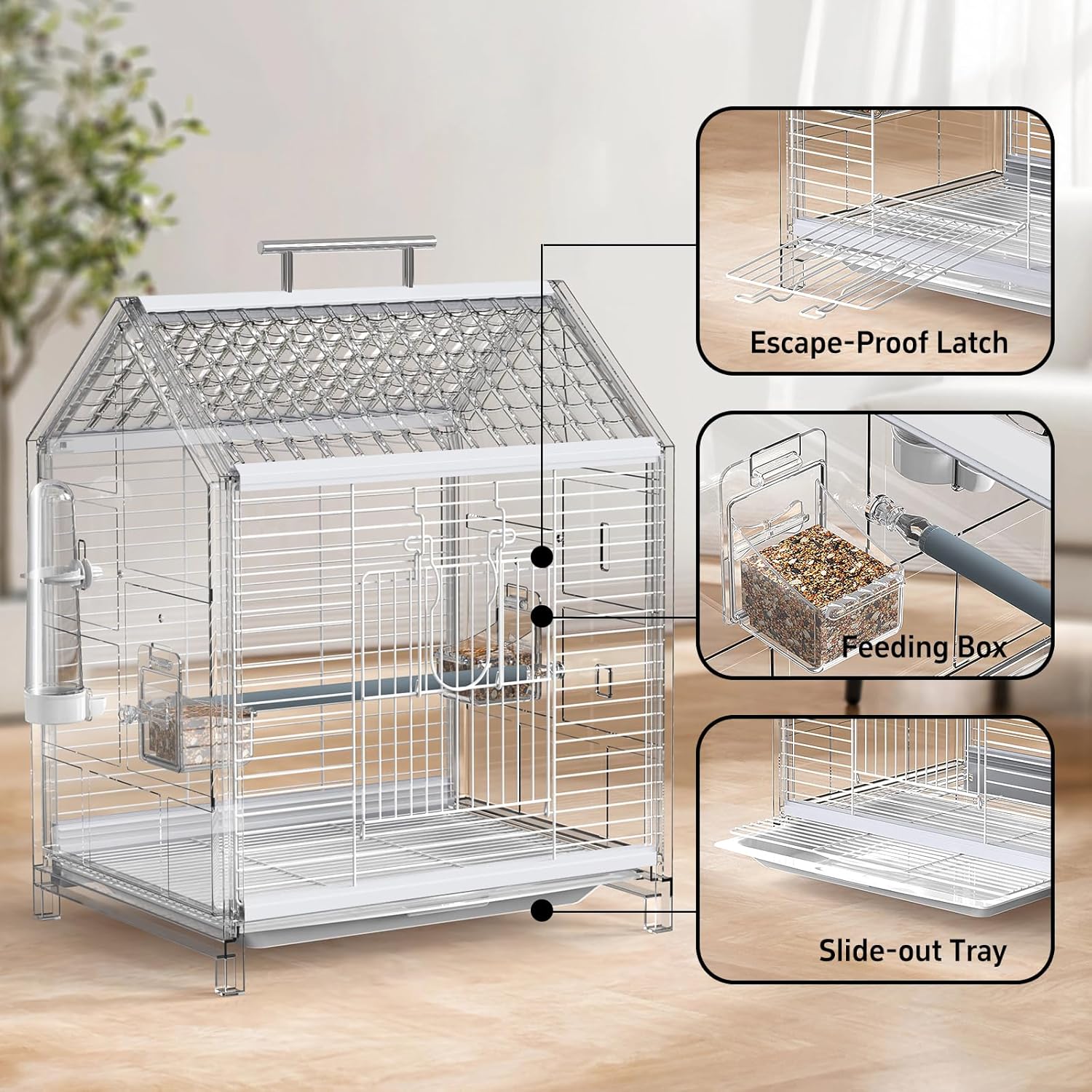 - 【Escape-Proof】The front door is equipped with a latch to prevent your clever little bird from opening it, keeping them securely inside the cage when you're not around.