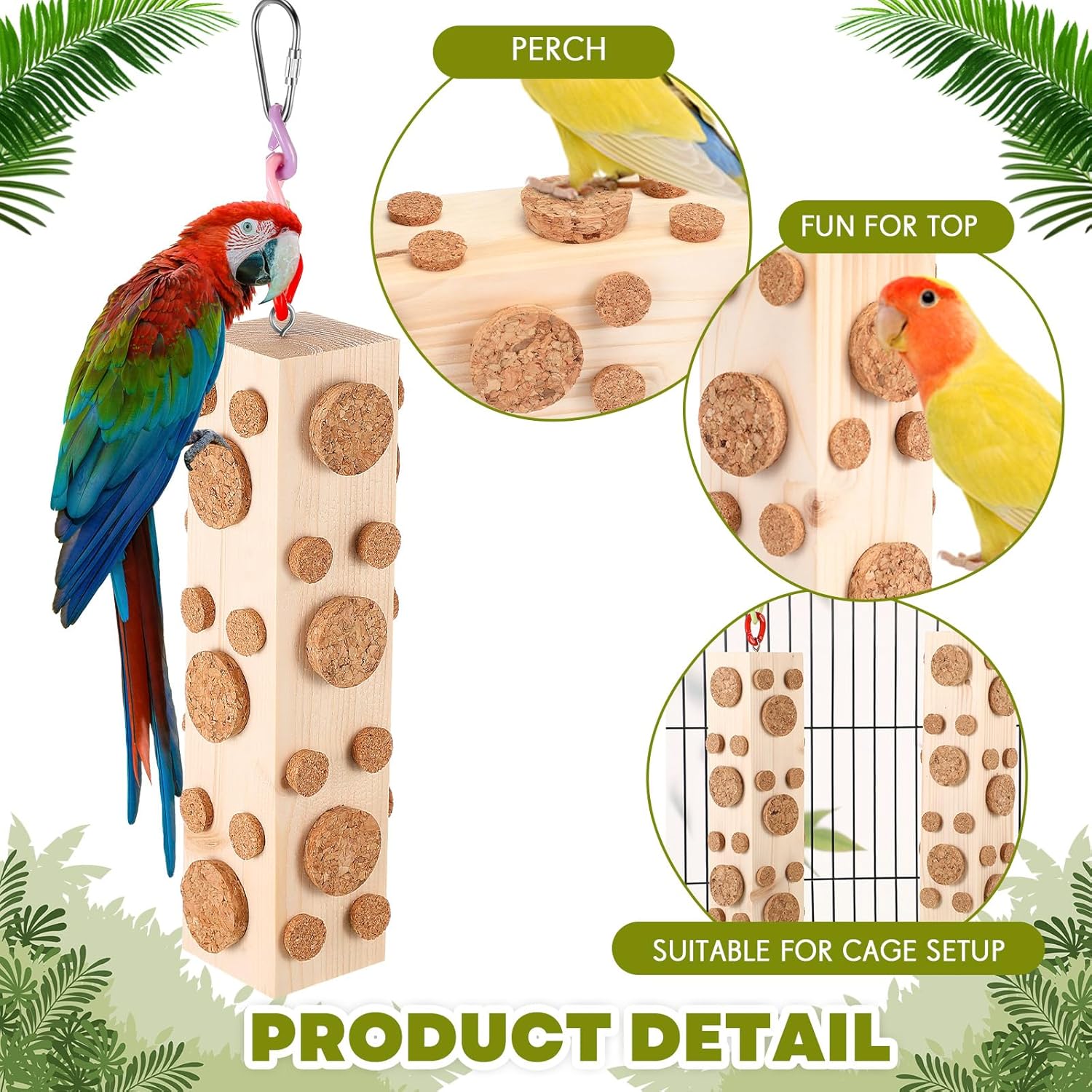 - Material Safety: the wooden foraging toys are handmade of solid wood, and the corks are made of oak, which makes it safe for your bird to gnaw and chew; Note: the oak corks should not be washed or exposed to water