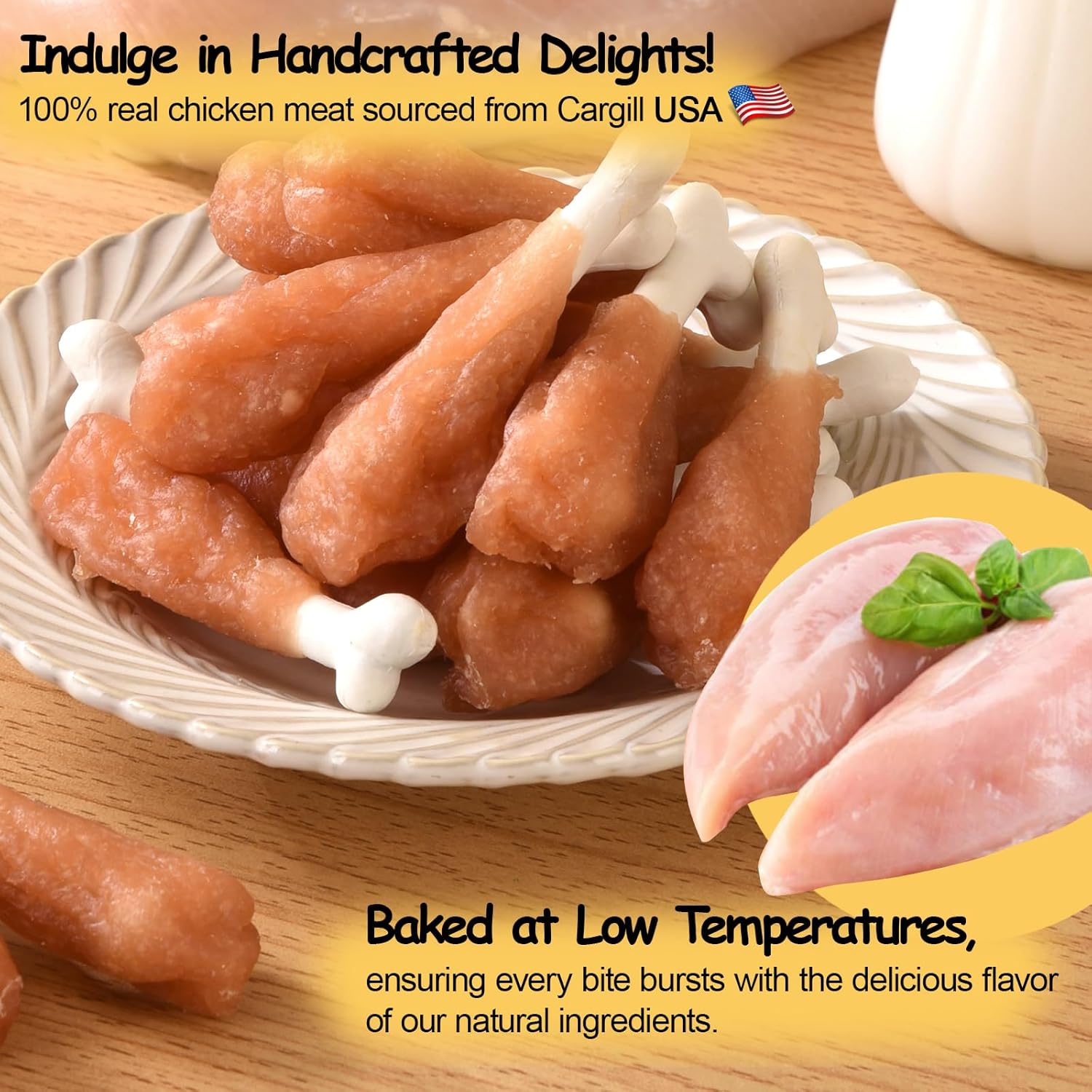 - NUTRITION COLLOCATION - The chicken dog treat contains calcium, which is good for dog physical strength and strong bones. It is rich in protein and low in fat, which is good for immunity.