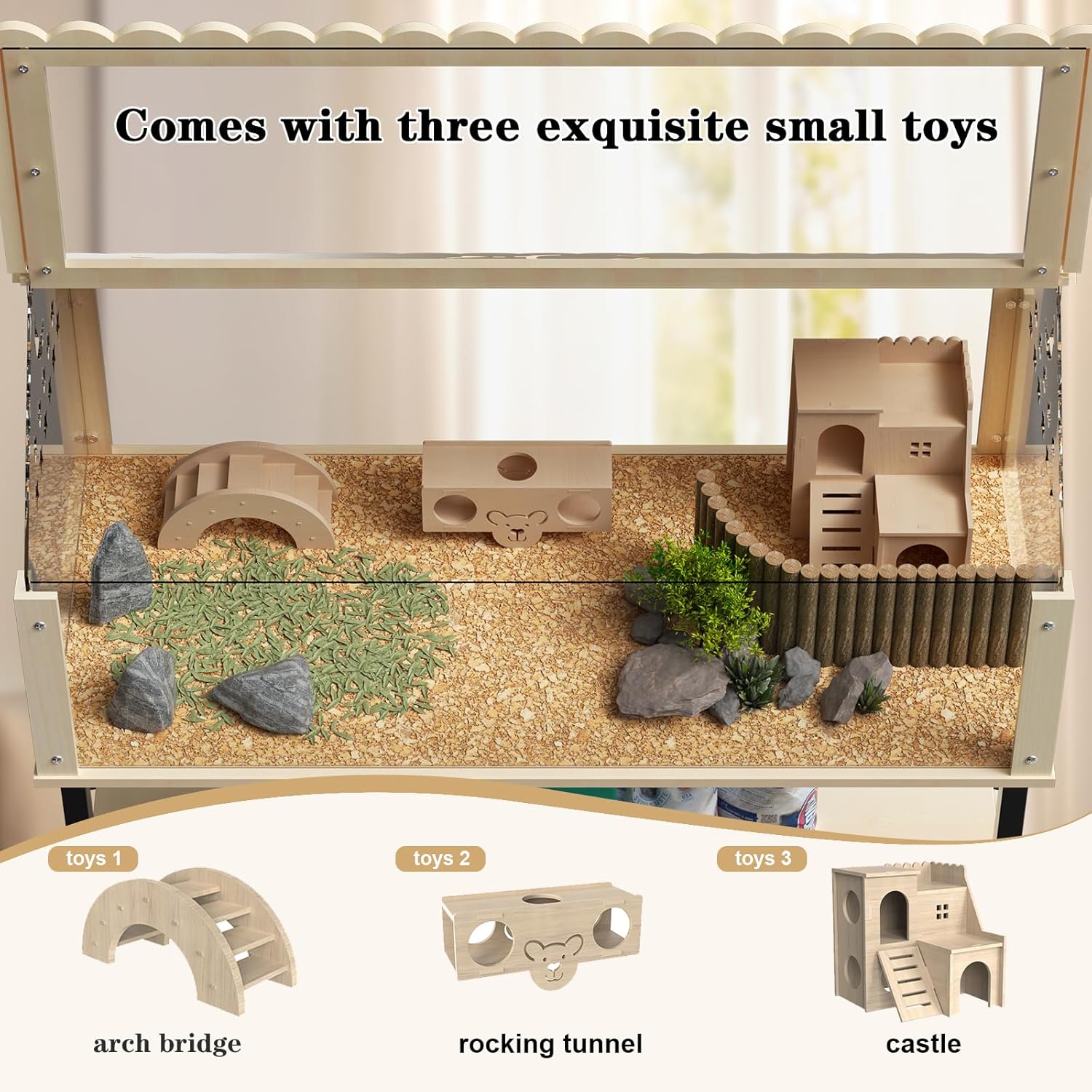 - đăGood Ventilationă: The cage is made of wood frame and clear acrylic panels, providing a durable and lightweight structure. The four sides are wrapped with wooden strips to prevent hamsters from chewing on the cage and protect their teeth.