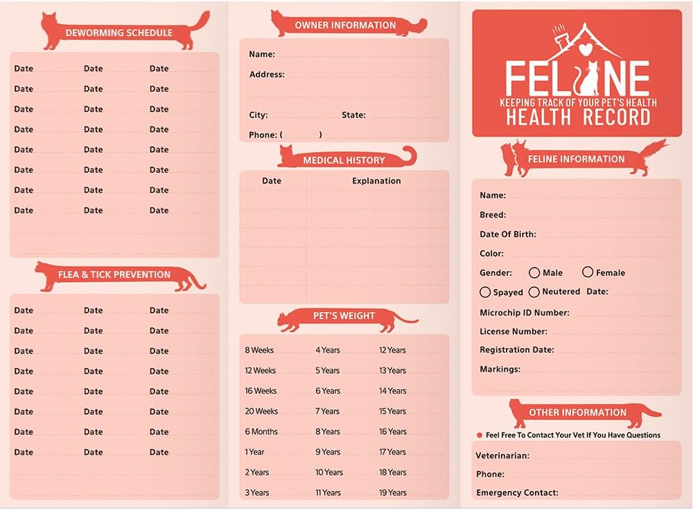 - [Function] The 24 Bulk Pack Kitten record is suitable for vet offices, breeders, and pet owners to track feline immunization records, deworming schedules, weight logs, vet appointments, medical history, and pet information (breed, age, gender, owner contact).