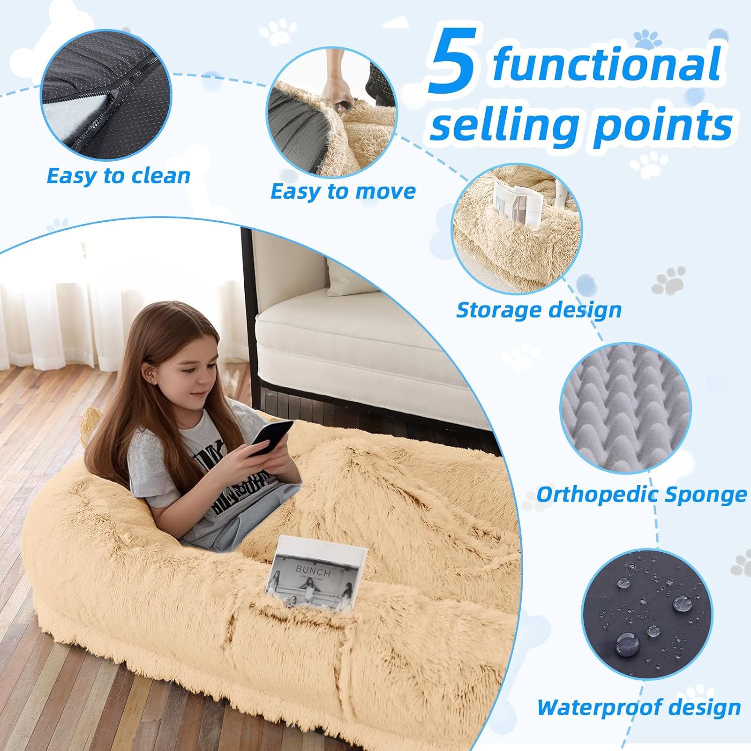 - Comfortable & Convenient: Human dog bed uses premium faux fur plush as the bed cover fabric, which is soft, warm, breathable, and durable. In addition, 1. we have added a storage pocket on the side so that you can put some small items when you lie down inside; 2, we have also presented a strap, so that you can easy storage the Extra large dog bed.