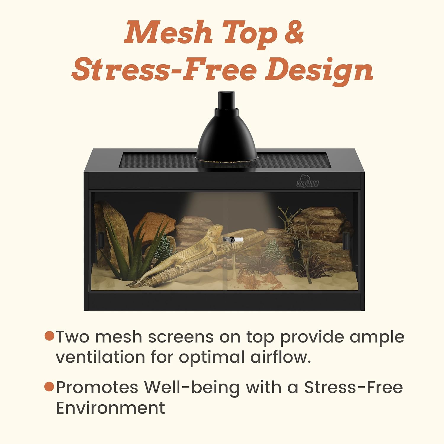- 【Secure Glass Door & Ventilated Top】Features a front-opening tempered glass door with a lock and handle for easy access and security. The durable mesh top ensures excellent ventilation and allows UVB and heat penetration, creating a comfortable habitat for your pets.