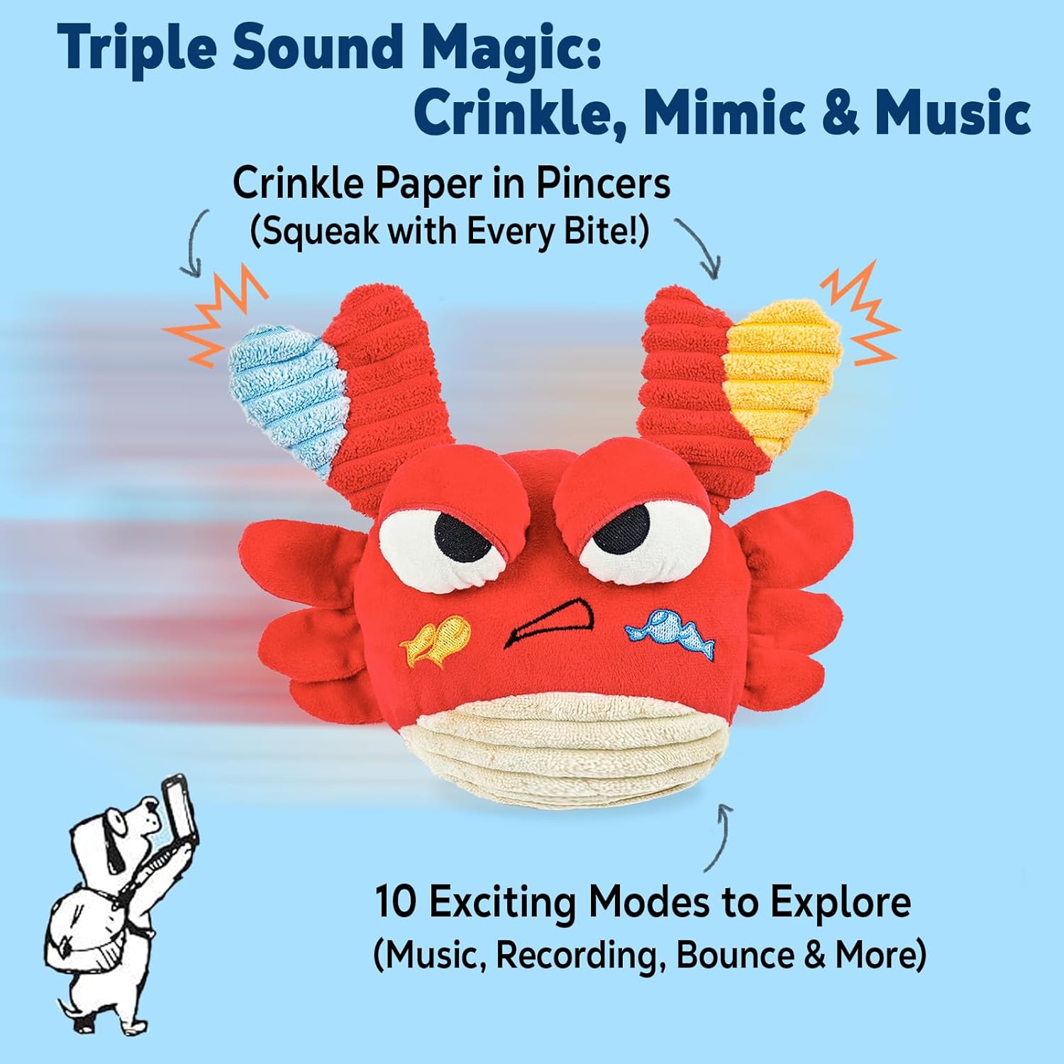 - Three Mode Interactive Dog Toy: There are three modes for dog bouncing balls: bouncing, singing and recording talking, puppy can activate the interactive toy by tapping it to make them bounce. Crab bouncing ball can dance continuously for an hour, after charging with the provided charger for 30 minutes, with long-lasting bouncing that is not easy to break. Cute dog crab plush toy with filled crinkle paper, music and rustling sounds will increase the interest of dogs in playing.