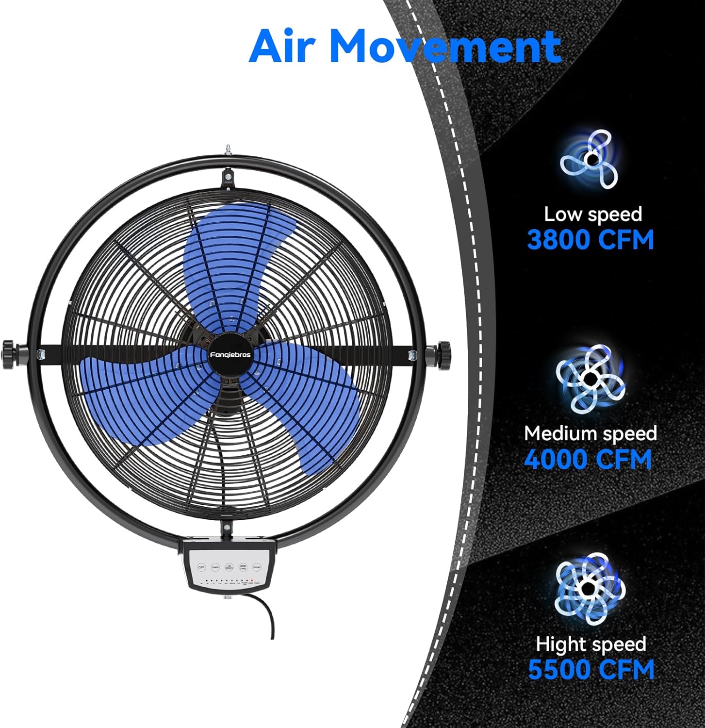 - ๐๐ข๐ ๐ก ๐๐๐ฅ๐จ๐๐ข๐ญ๐ฒ ๐๐ข๐ซ ๐ ๐ฅ๐จ๐ฐ - The heavy duty wall fan design makes the operation more intuitive and simple, and the high, medium and low speeds can be adjusted by the remote control to meet different needs. High speed 5500 CFM, medium speed 4000 CFM, low speed 3800 CFM, providing hurricane-like airflow to meet your garages, shops or outdoor use๏ผNote: used on a covered patios or porch, BUT NOT EXPOSED TO RAIN๏ผ