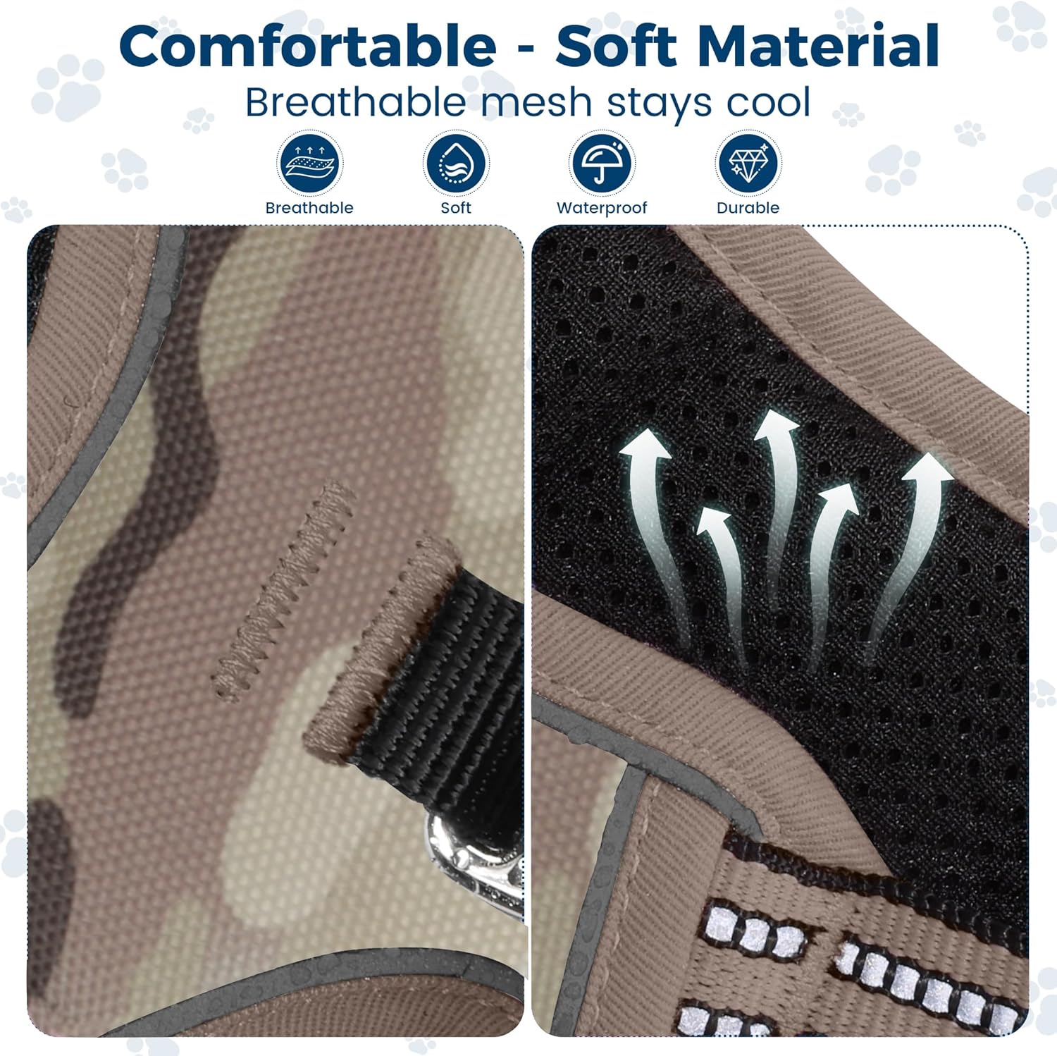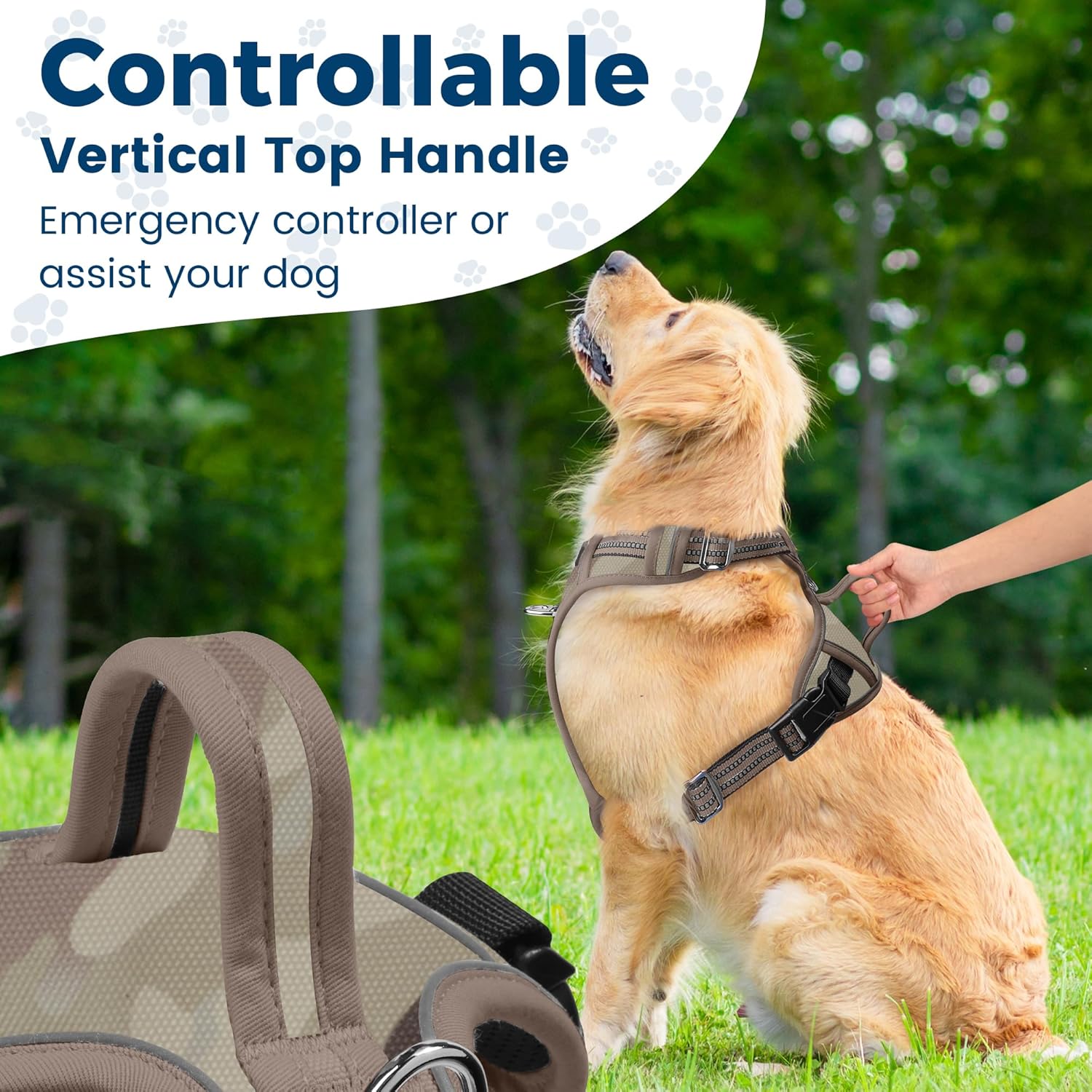 Funfox Dog Harness No Pull, Adjustable Pet Vest Harness, Super Soft Material with Vertical Handle Easy Control, Reflective Night Walking, 2 Leash Clips for Large Dogs, Camo Brown, L
