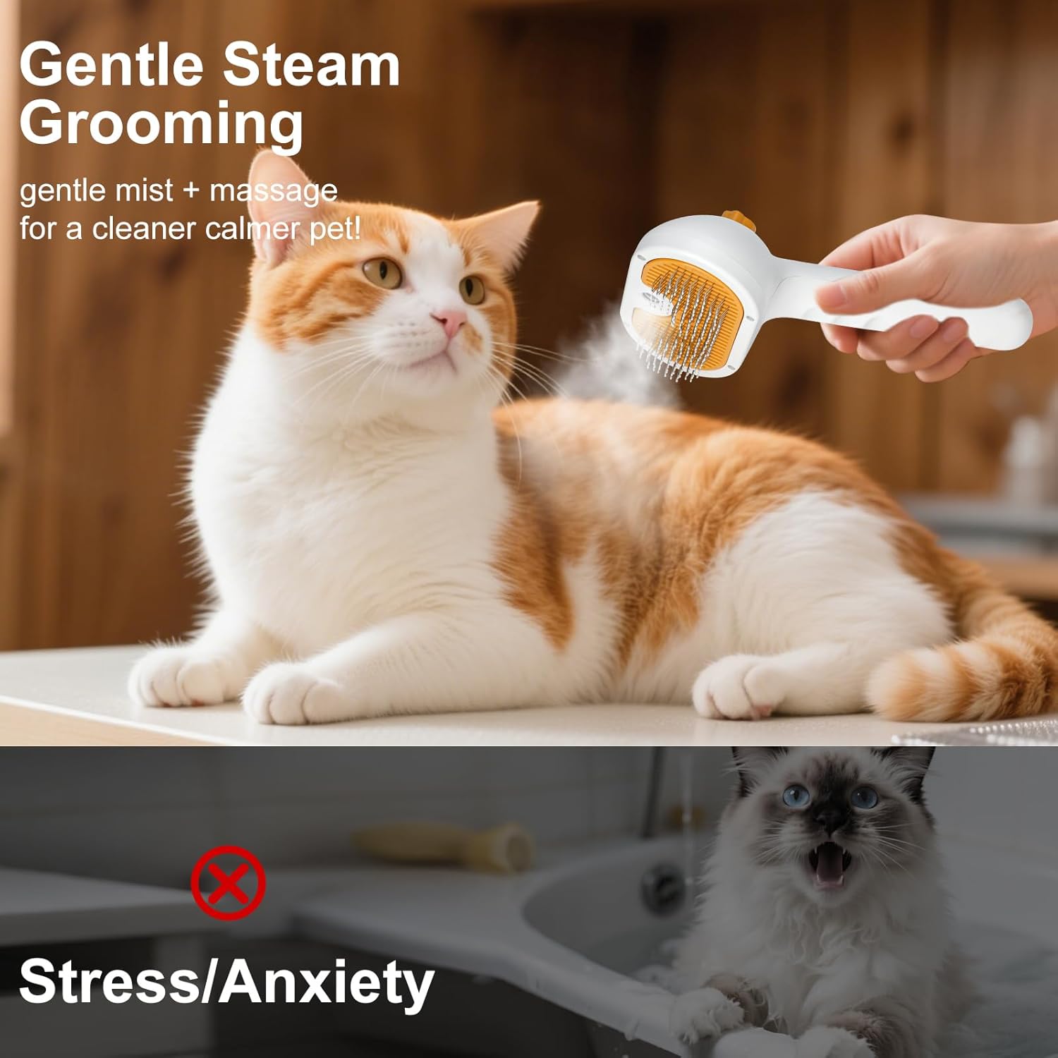 - 【Sturdy, Safe and Skin-Friendly Cat Brush】: This cat steam brush are made of high-quality ABS plastic for the casing and stainless steel for the bristles. And, we've wrapped the bristles in a protective gel to ensure effective removal of dead skin and loose hair while protecting your pet's skin from damage. You can add conditioner or softener to the spray when you want to enhance the softness and shine of your cat's coat