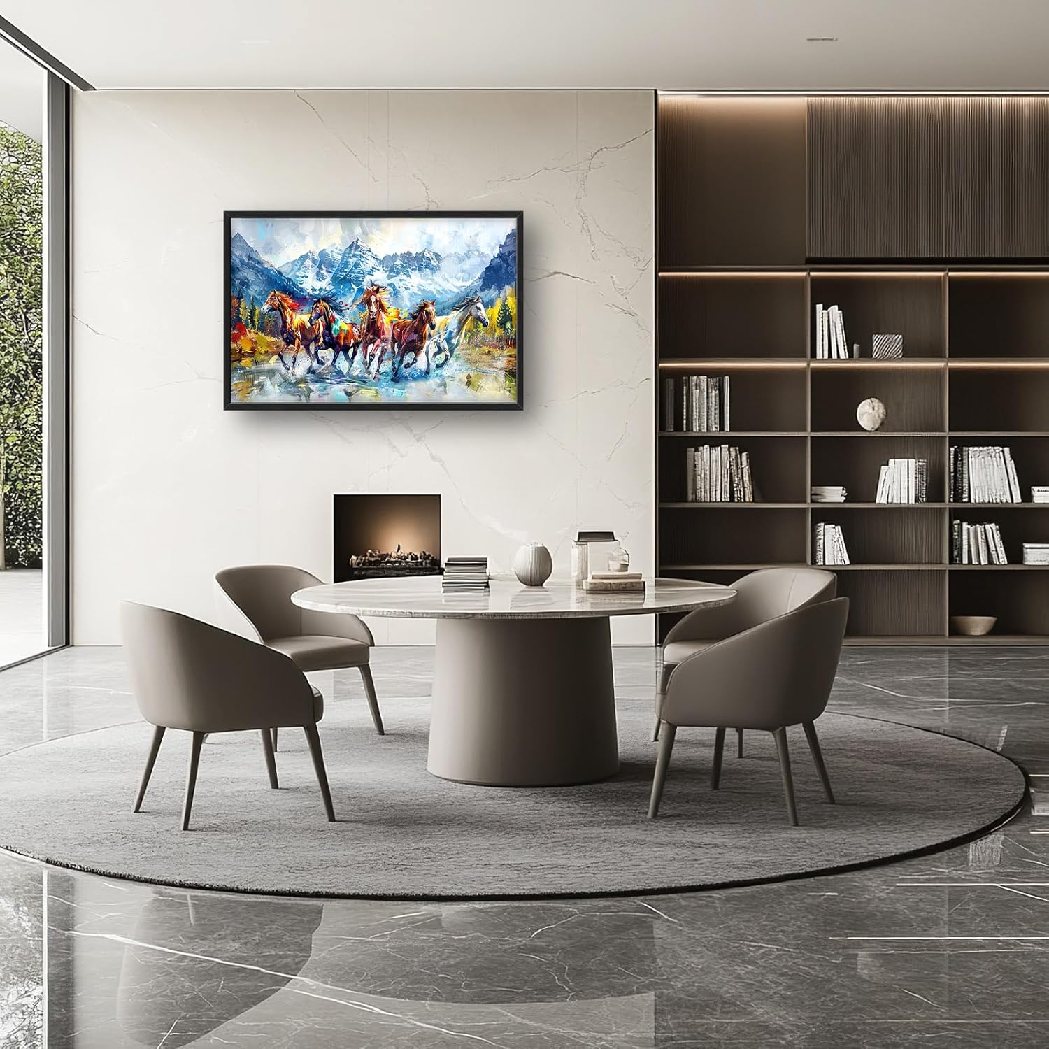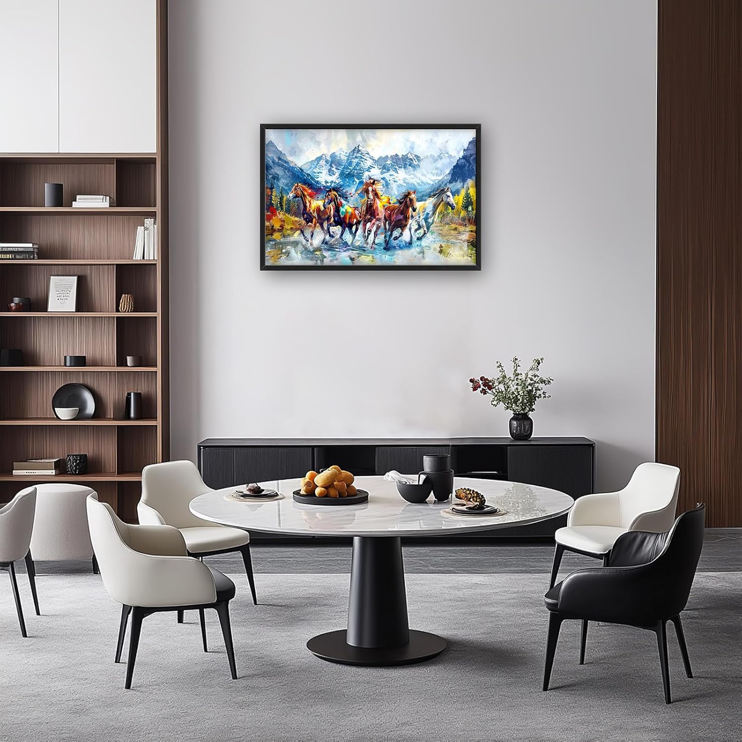 - 【Unique Design】A group of horses galloping in the mountains, with an oil painting style and colorful colors. The composition is symmetrical left to right, with clear details on each horse's face. In front view, there should be five horses running towards us, surrounded by snow-capped peaks and dense forests. The background features a flowing river with water splashing around them.