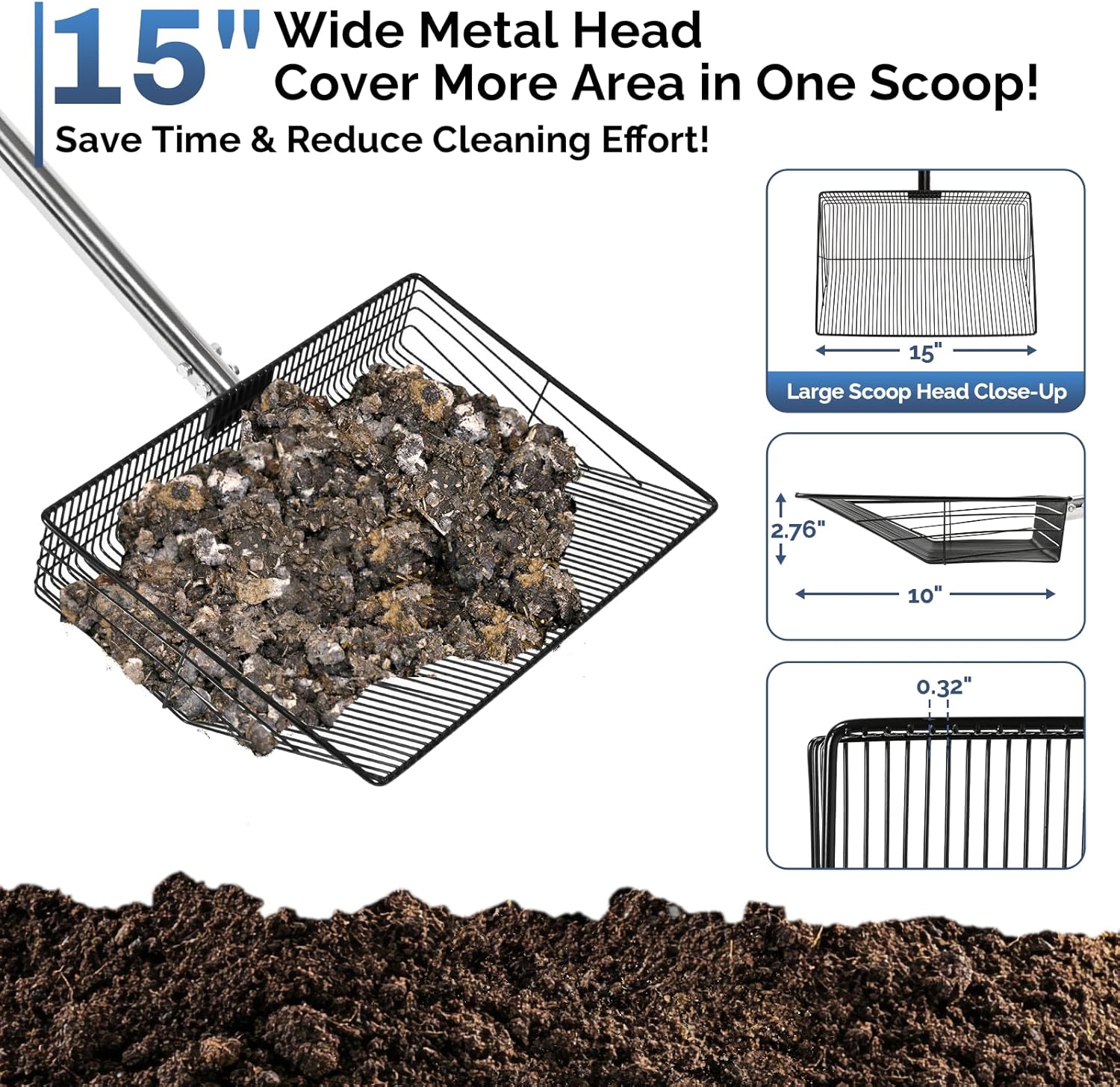 15" Extra-Wide Chicken Poop Scooper โ Ergonomic Adjustable Handle (24-70in), Stainless Steel Sifting Shovel Deep Litter Cleaning for Chicken Coops, Goat - Chicken Coop Scoop for Sand, Straw, Hemp