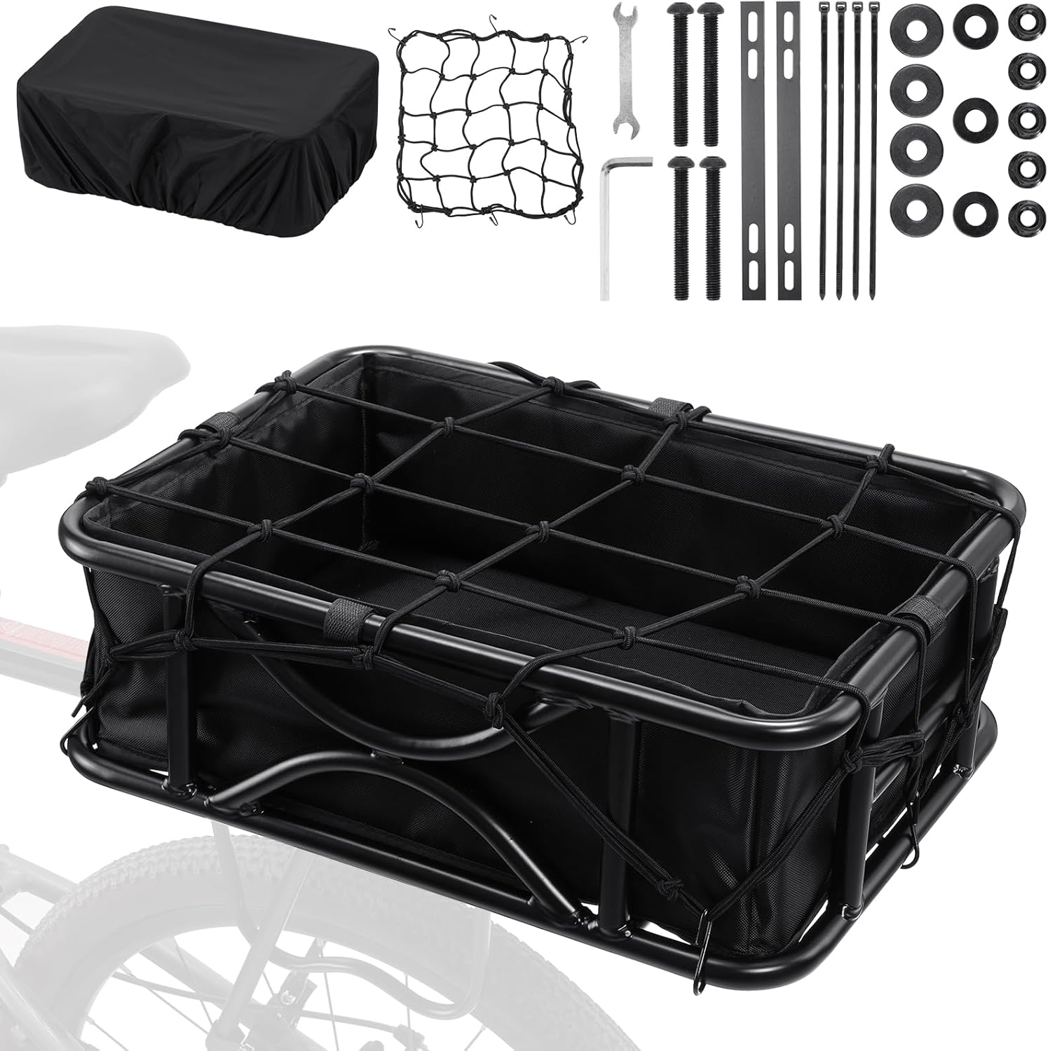 - High Capacity & Versatile: Bike cargo rack basket with large capacity (42x32x15cm) to carry groceries, small pets, and more. Includes an Oxford cloth liner bag, waterproof cover, and cargo net.