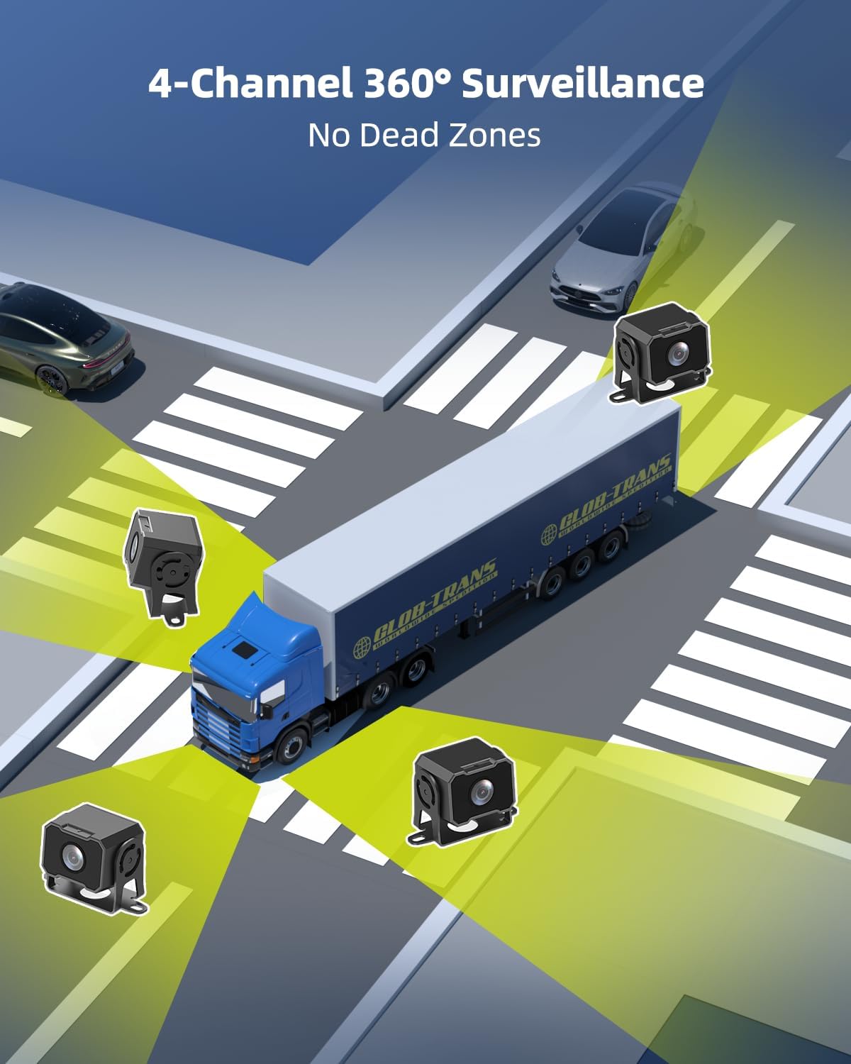 - ăReversing Blind Spot TerminatorăBased on the coordinated operation of four 1080P ultra-clear waterproof cameras, this system uses real-time image synchronization transmission technology to build a 360° panoramic bird's-eye view of the vehicle body, eliminating safety hazards in scenes such as reversing blind spots, side obstacles and narrow road encounters, and provides all-weather and blind-angle driving protection for commercial vehicles, passenger cars, and special operation vehicles.