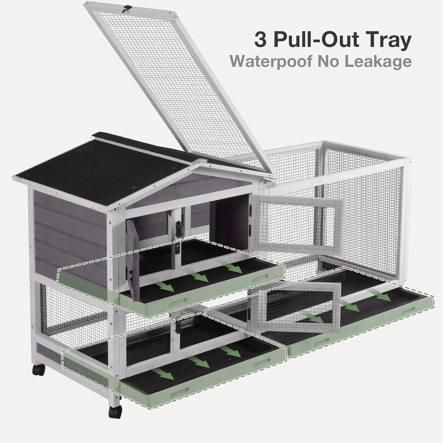 - Easy Cleaning and Maintenance:Designed with convenience in mind, this rabbit hutch features three pull-out trays that are waterproof and leak-proof, making cleaning a breeze. The multiple access points allow for easy cleaning without disturbing your pets