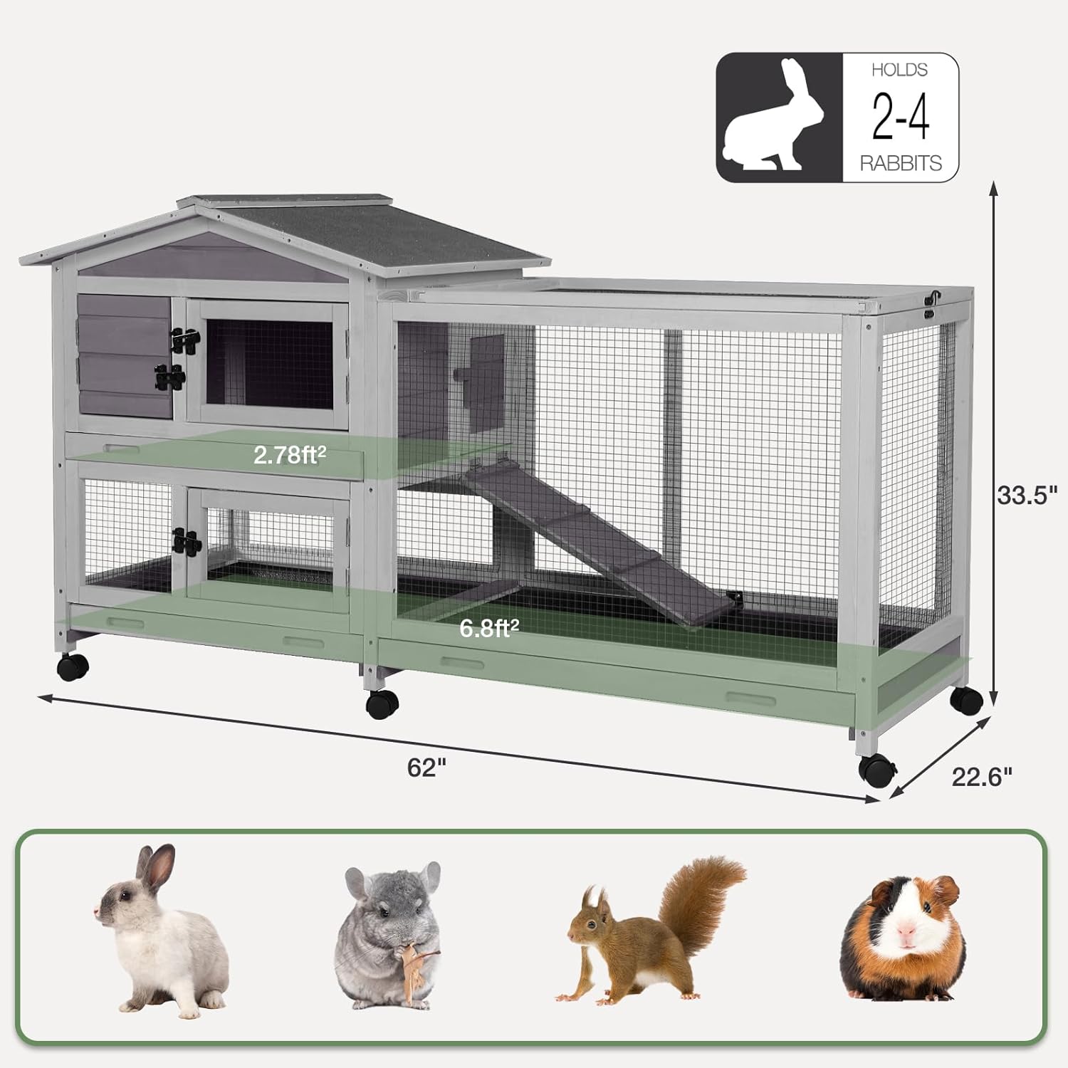 - Spacious Living Quarters:Our mobile rabbit hutch provides ample space for up to 2-4 rabbits to live comfortably. With a total area of 9.58 square feet, divided into a 2.78 square foot living area and a 6.8 square foot outdoor run, your pets will have plenty of room to hop, play, and rest