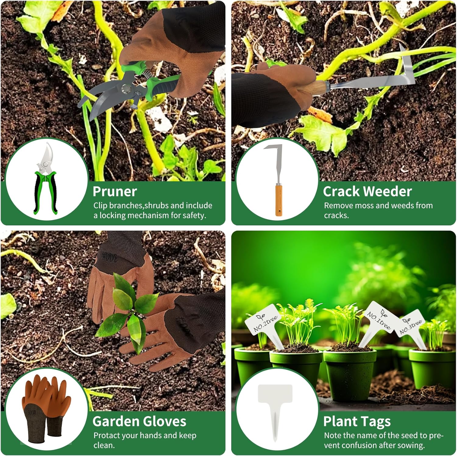 - 【20-Piece Complete Gardening Tool Set】- This all-in-one gardening kit includes a Large Garden Trowel, Transplanting, Crack Weeder, Hand Rake, Hand Weeder, Pruner, a pair of Gardening Gloves, 12 Plant Tags, and a Garden Tool Organizer Bag. Each tool features a convenient hanging hole for easy organization, keeping your garden tools neatly stored and ready for use.