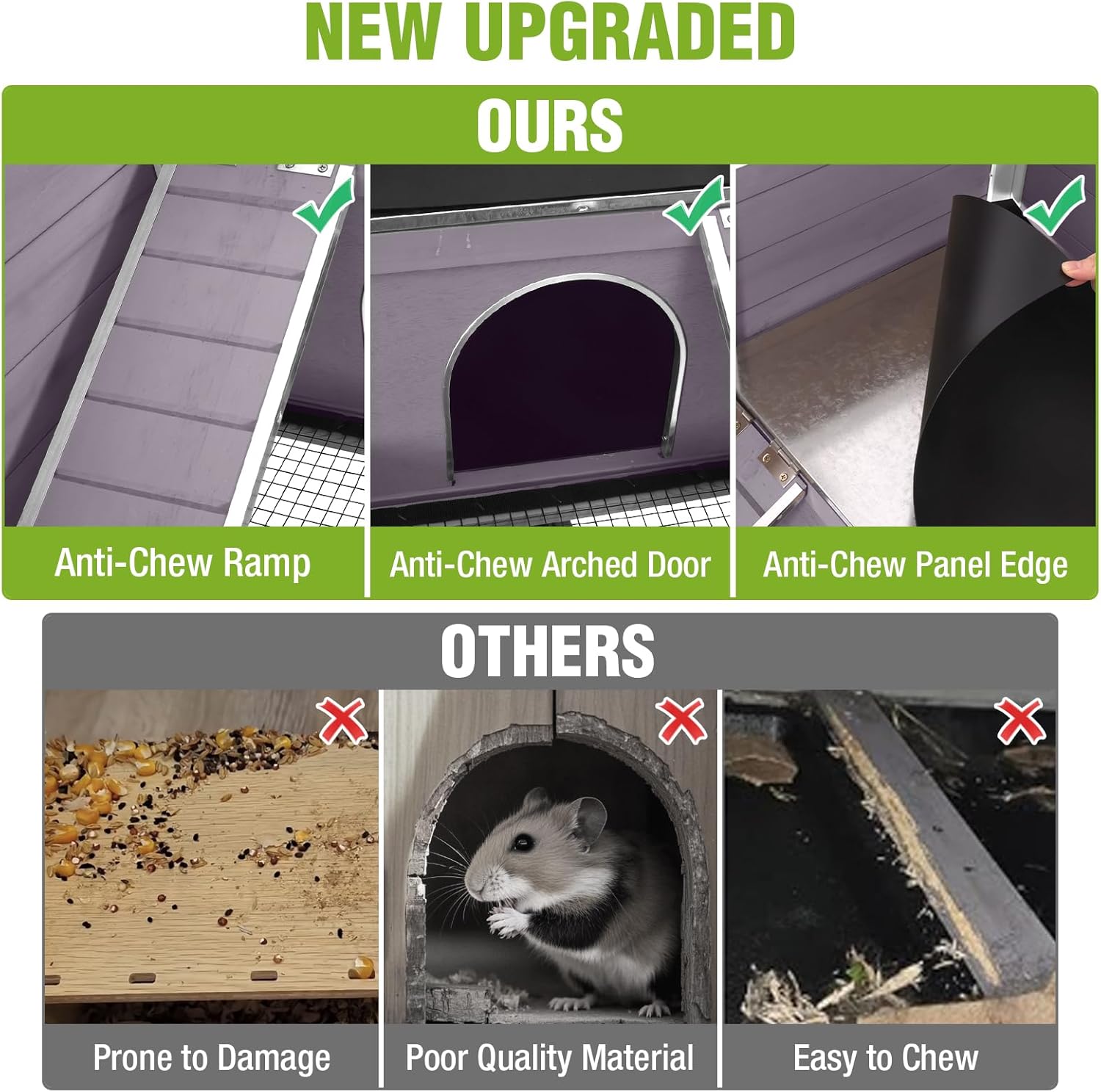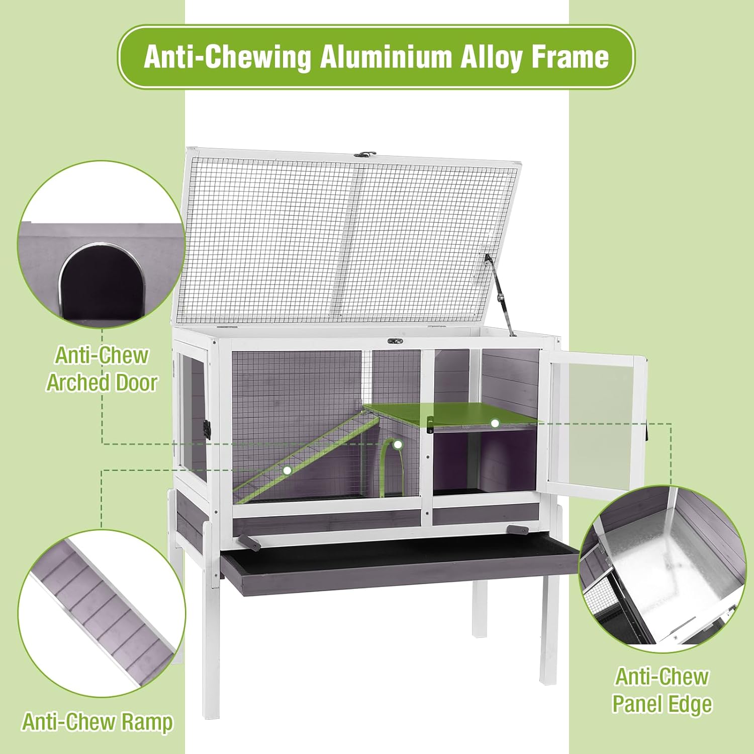 - ANTI-CHEWING ALUMINUM ALLOY FRAME: The edges of the ramp and curved door frame are upgraded to use a sturdy aluminum alloy frame to prevent small animals from damaging the cage,which is durable.