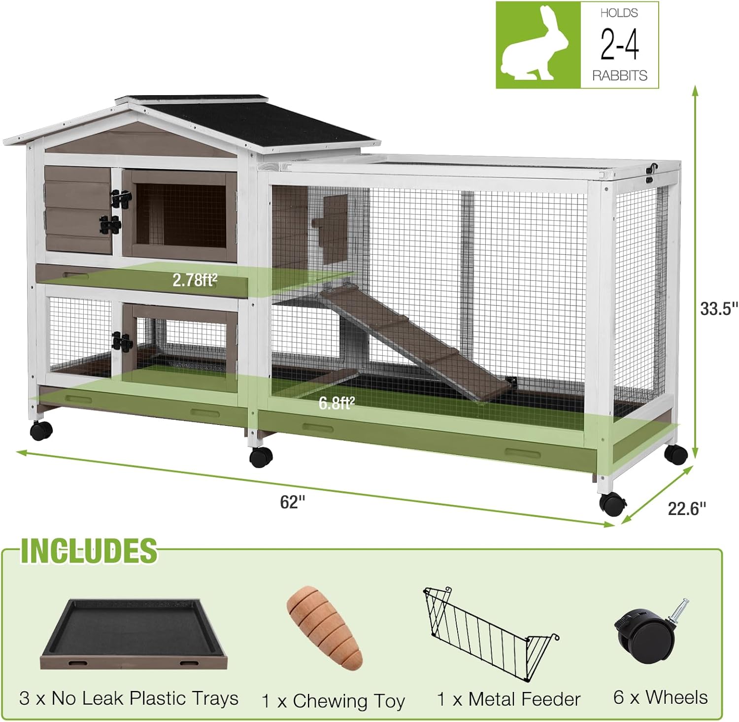 - Easy to Move: 6 smooth-gliding wheels let you push this bunny cage across grass, decks, or floors. 2 wheels includes a secure brake mechanism to keep the hutch stable during use, balancing mobility with safety.