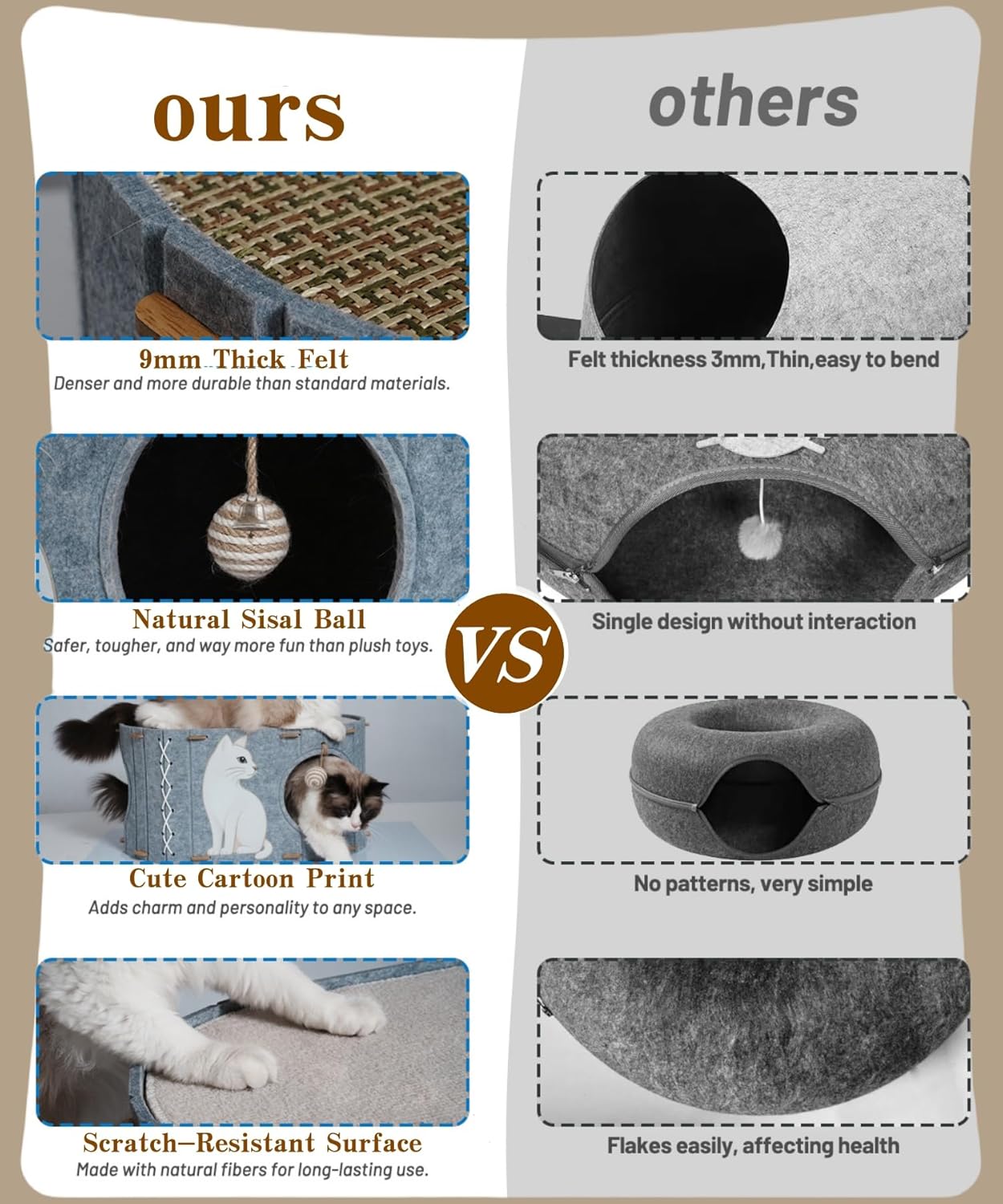 - STURDY COLLAPSE-FREE DESIGN FOR ACTIVE CATS:Crafted with thick felt panels and secure rope fasteners, this house won’t flatten or tip—even during crazy zoomies. It’s stable, safe, and built for cats who like to jump, scratch, and explore.