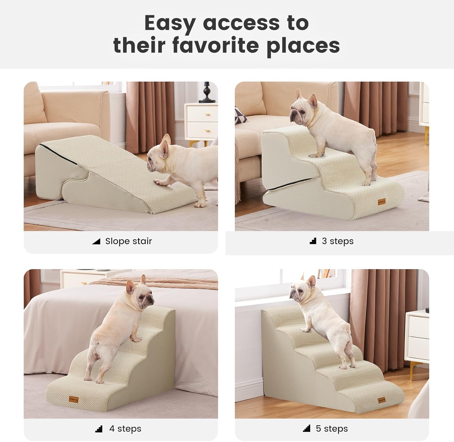 - Stable & Secure with Anti-Slip Base: Designed with rubber dots on the bottom, these pet steps for small dogs provide excellent grip and stability, preventing slips and falls. Your pet can climb confidently and safely. Choose from dog ramp for couch, chair and sofa (up to 18"), 3-step dog steps for couch (up to 20"), 4-step dog steps for bed (up to 25"), or 5-step (up to 28") dog steps for high bed, window and car.